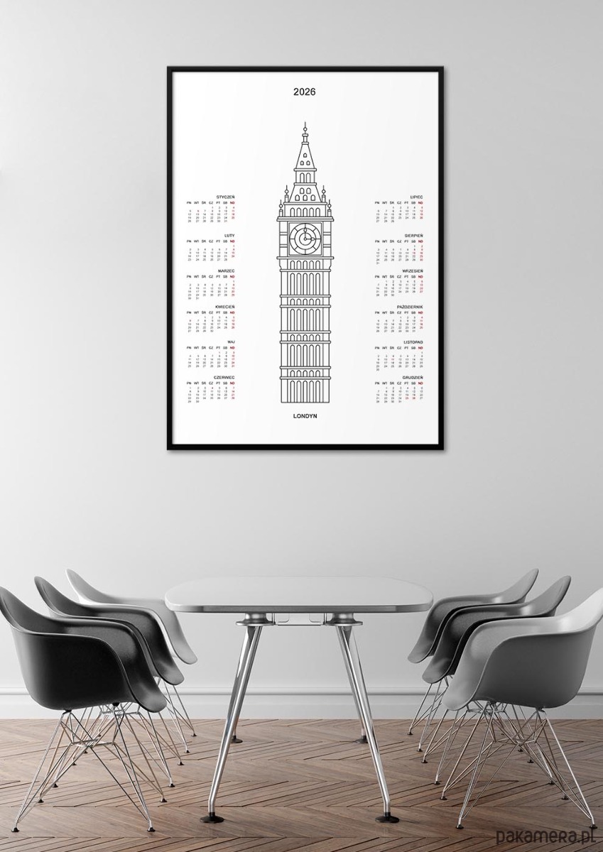 Centralnym motywem jest graficzna, minimalistyczna ilustracja Big Bena. Minimalistyczna forma, stonowana kolorystyka i czytelny układ kalendarium sprawiają, że produkt pełni rolę zarówno praktycznego kalendarza, jak i stylowej dekoracji ściennej.