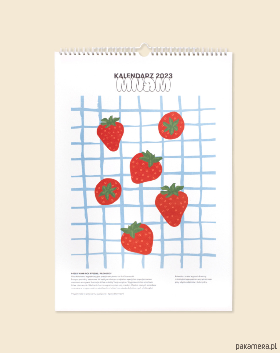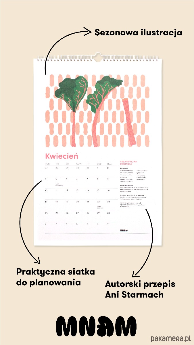 Kalendarz ścienny MNAM to idealny partner kuchenny na rok 2023. Na karcie każdego miesiąca znajdziesz autorską ilustrację sezonowego warzywa lub owocu oraz specjalnie przygotowany przez Anię Starmach przepis. Odkryjesz tam także, wszystkie te bardziej i mniej znane święta kulinarne, jak na przykład dzień czekolady, pizzy, jabłka czy twarogu – dzięki temu będzie, to doskonała okazja do wielu kulinarnych wyzwań w nadchodzącym roku. Dodatkowo nasz kalendarz jest wygodny i funkcjonalny, na prostej siatce bez problemu znajdziesz miejsce na zaznaczenie ważnych dla Ciebie dat i wydarzeń.