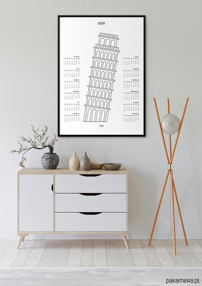 Centralnym motywem jest subtelna, liniowa ilustracja Krzywej Wieży w Pizie. Minimalistyczna forma, stonowana kolorystyka i czytelny układ kalendarium sprawiają, że produkt pełni rolę zarówno praktycznego kalendarza, jak i stylowej dekoracji ściennej.