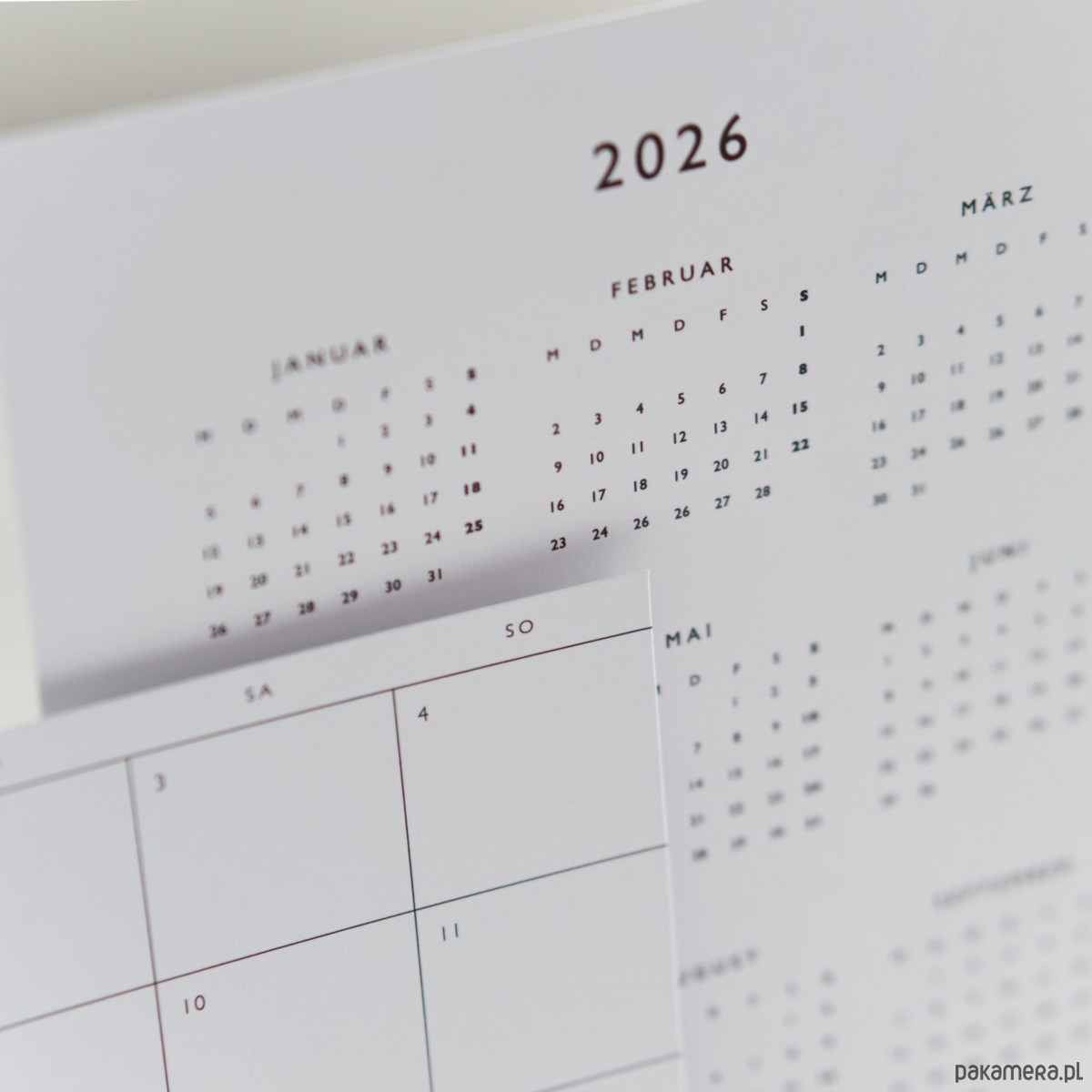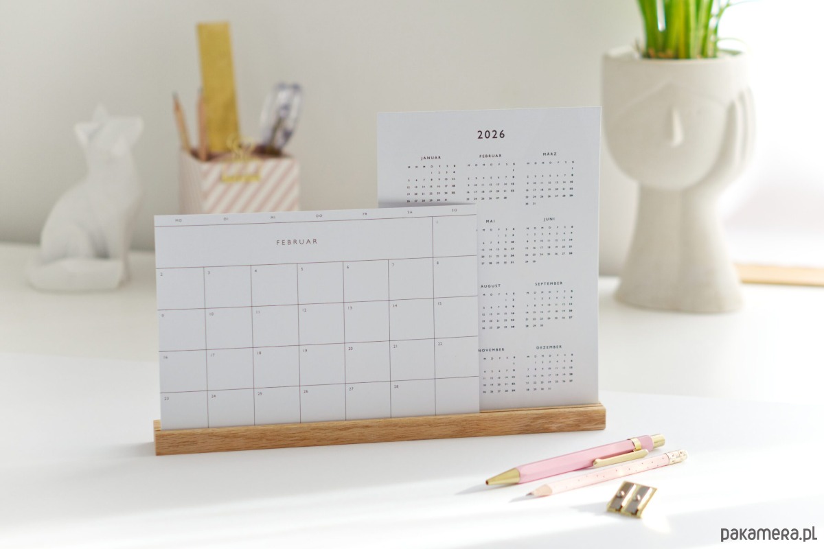 Ten miesięczny planer w formacie A5 zawiera 6 dwustronnych kart premium (300 gsm) — po jednym miesiącu na każdej stronie. Każda minimalistyczna strona kalendarza oferuje miejsce na codzienne notatki, wydarzenia, święta i urodziny, z całym miesiącem na jednej stronie.Dodatkowa karta A5 z ilustracją botaniczną i rocznym kalendarzem na 2026 rok dodaje stylowego akcentu i pomaga ogarnąć cały rok w jednym miejscu.Kalendarz jest wyposażony w solidną podstawkę z naturalnego dębu — piękną, stabilną i wielokrotnego użytku. Możesz postawić ją na biurku lub zawiesić na ścianie dzięki dyskretnym otworom montażowym z tyłu. Idealny do nowoczesnego miejsca pracy, domowego biura lub jako przemyślany prezent dla miłośników planowania i minimalizmu.Szczegóły:6 dwustronnych kart A5