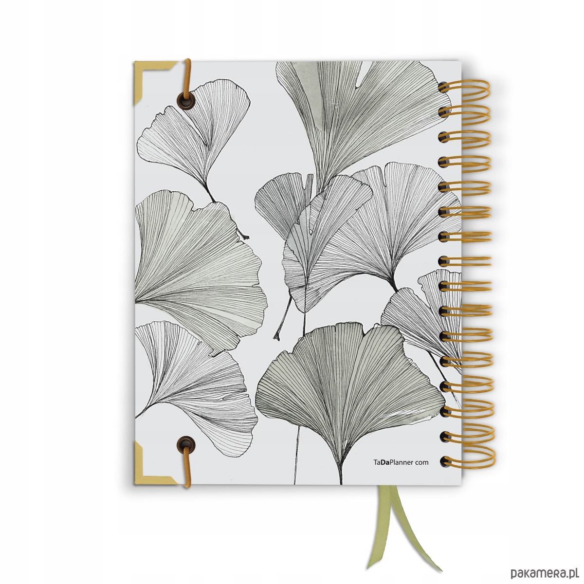 Dodatki: zakładka wstążkowa, metalowe ochraniacze zabezpieczające narożniki, gumka, która nie pozwoli otworzyć się kalendarzowi w nieoczekiwanym momencie, koperta/kieszonka z tyłu planera na wszystkie luźne notatki, małe dokumenty, naklejki lub rachunki.