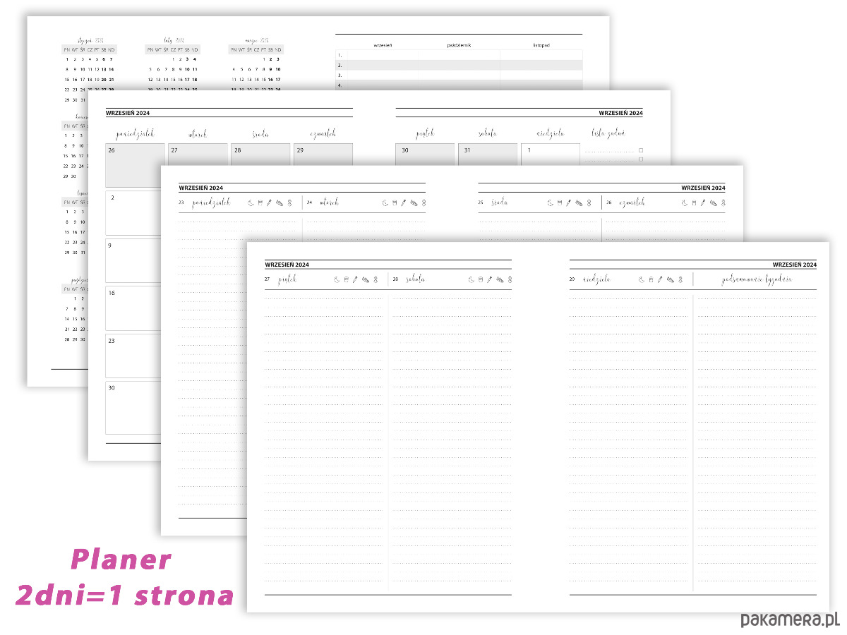 KALENDARZ DWA DNI NA STRONIE, stron: 246, każdy tydzień na czterech stronach w układzie pionowym, miejsce na podsumowanie tygodnia. Dodatkowy koszt to 15 zł płatne na konto po zamówieniu.