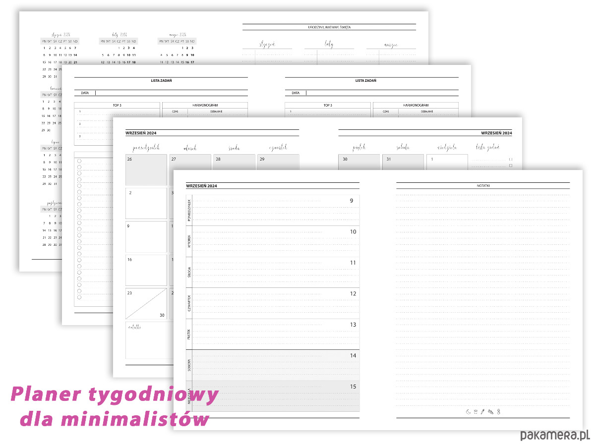 KALENDARZ TYGODNIOWY MINIMALISTY, stron: 172, każdy tydzień na jednej stronie w układzie poziomym, druga strona - miejsce na notatki;
