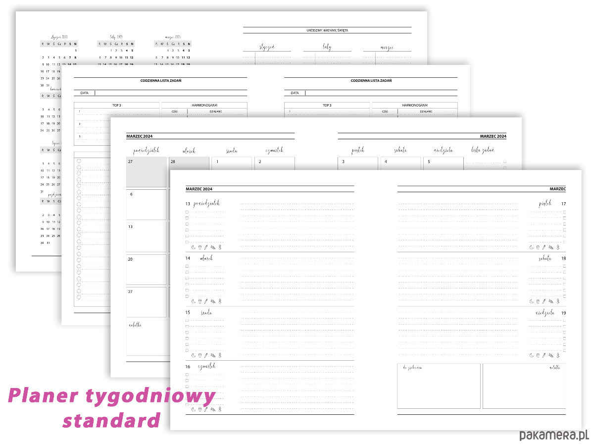KALENDARZ TYGODNIOWY - stron: 170, każdy tydzień na dwóch stronach w układzie poziomym, listy TO DO;