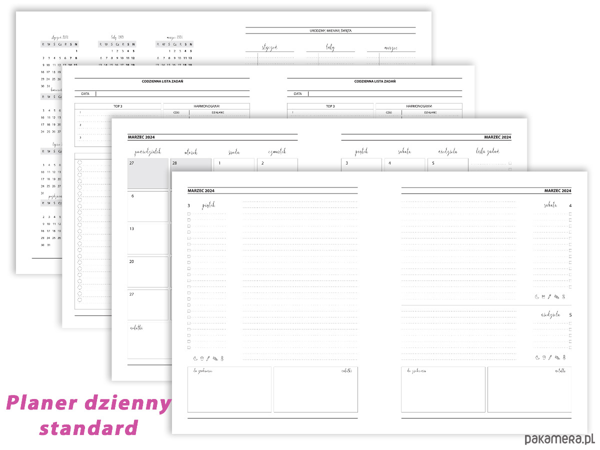 KALENDARZ DZIENNY, stron: 372 każdy dzień na osobnej stronie, sobota i niedziela razem, listy TO DO. Dodatkowy koszt to 29 zł płatne na konto po zamówieniu.