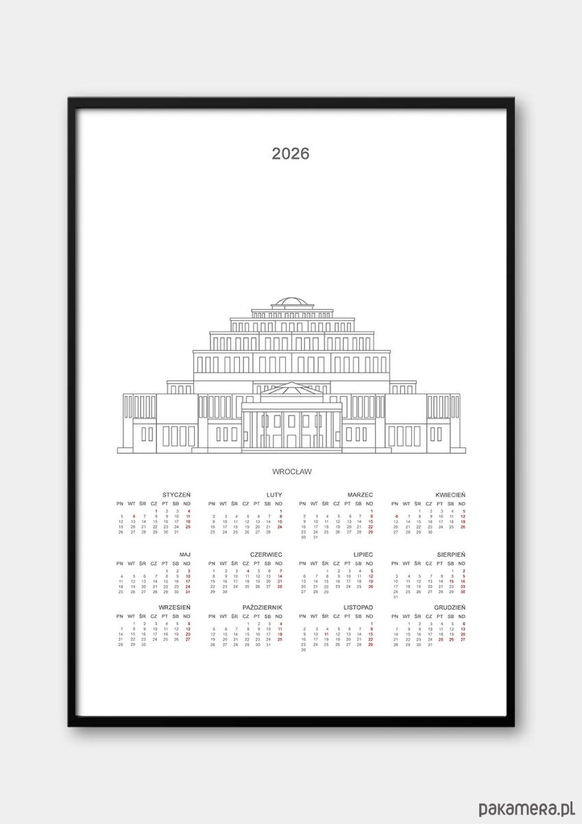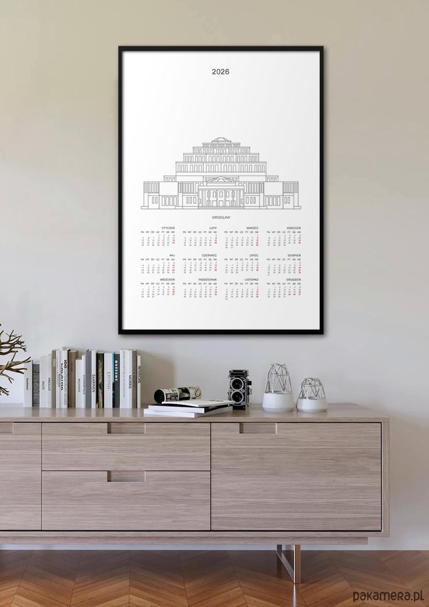 Centralnym motywem jest subtelna, liniowa ilustracja Hali Stulecia. Minimalistyczna forma, stonowana kolorystyka i czytelny układ kalendarium sprawiają, że produkt pełni rolę zarówno praktycznego kalendarza, jak i stylowej dekoracji ściennej.