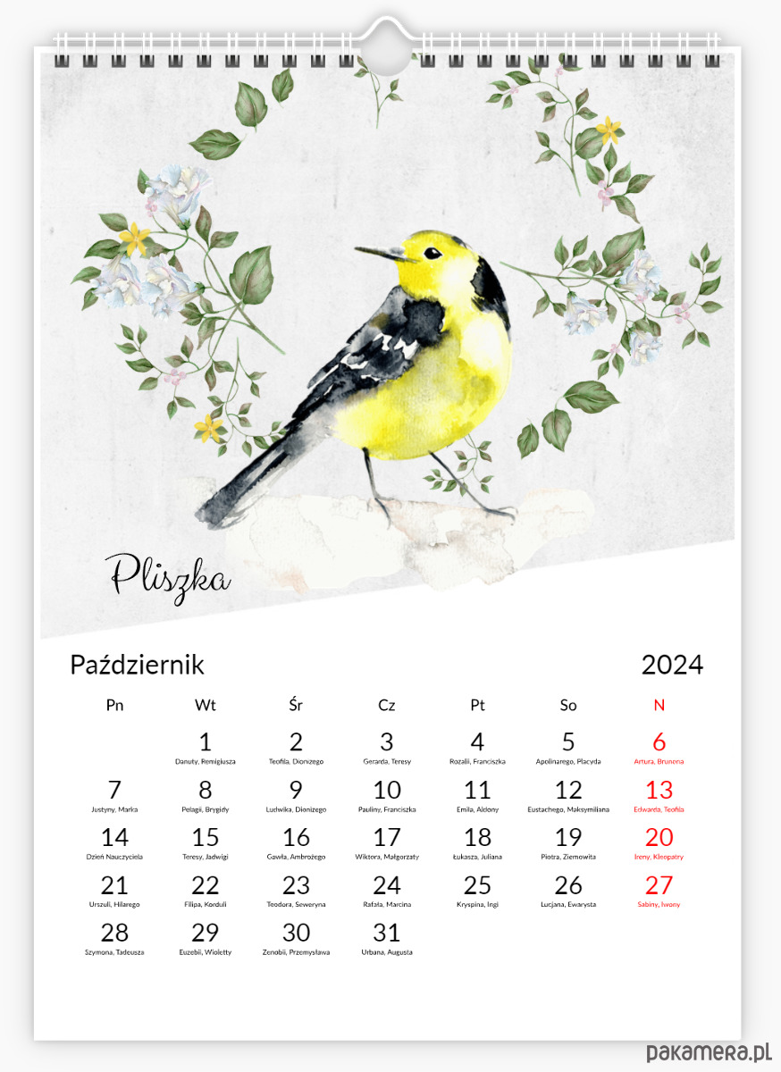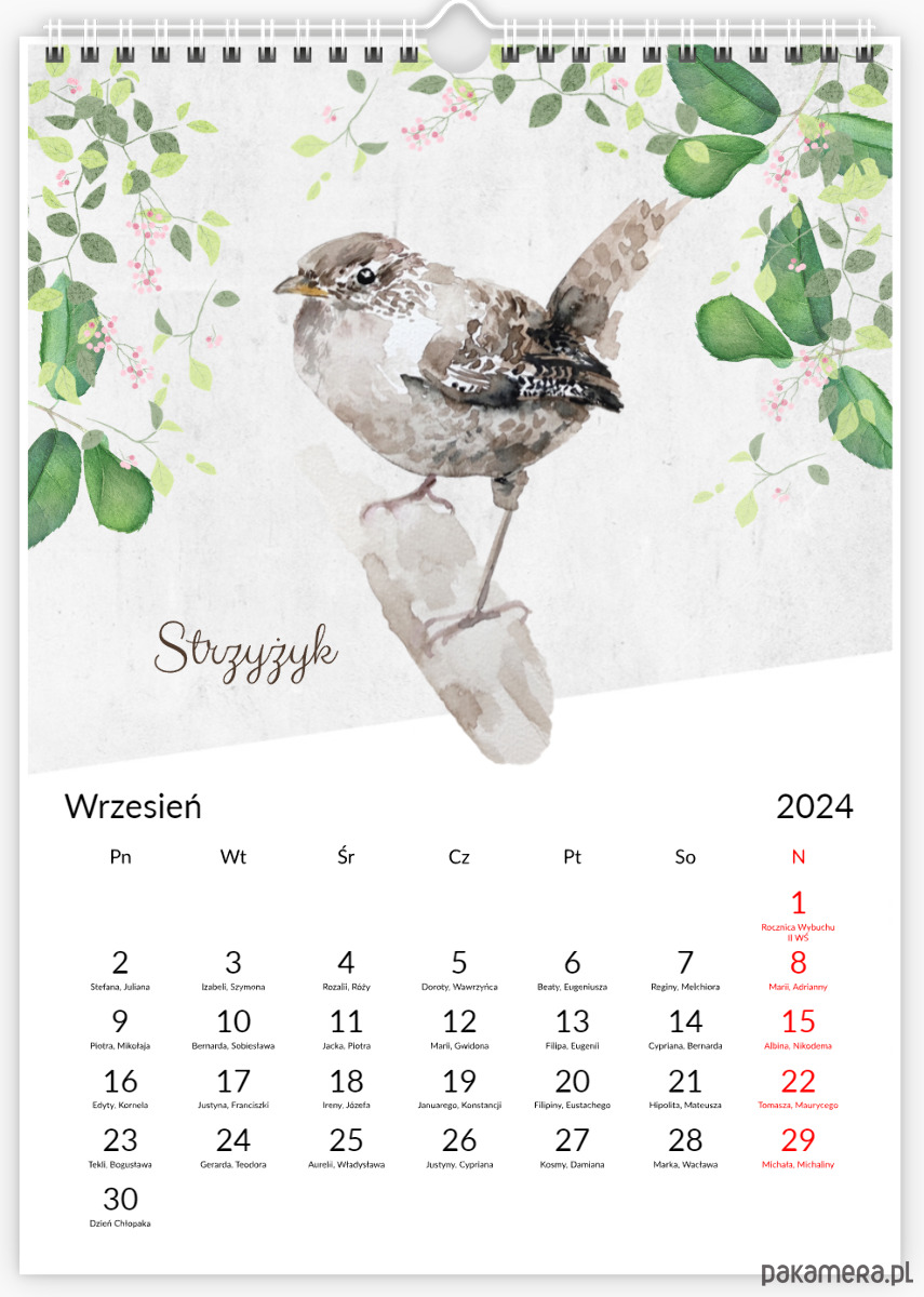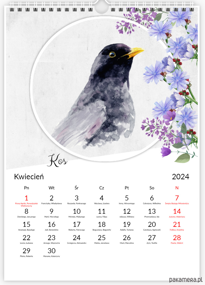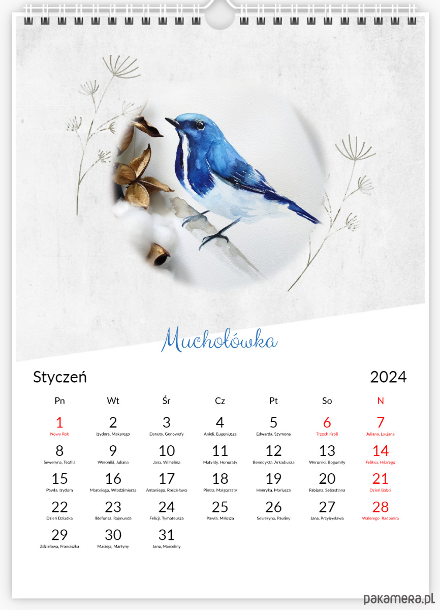Oryginalny autorski kalendarz z ptakami. Każdy miesiąc zawiera inny obrazek, zarówno ukazujący akwarelki z ptakami, które namalowałam w tym roku.