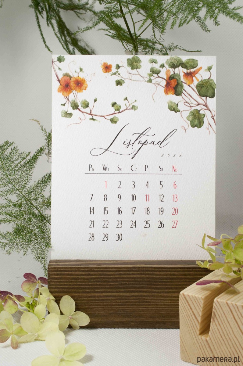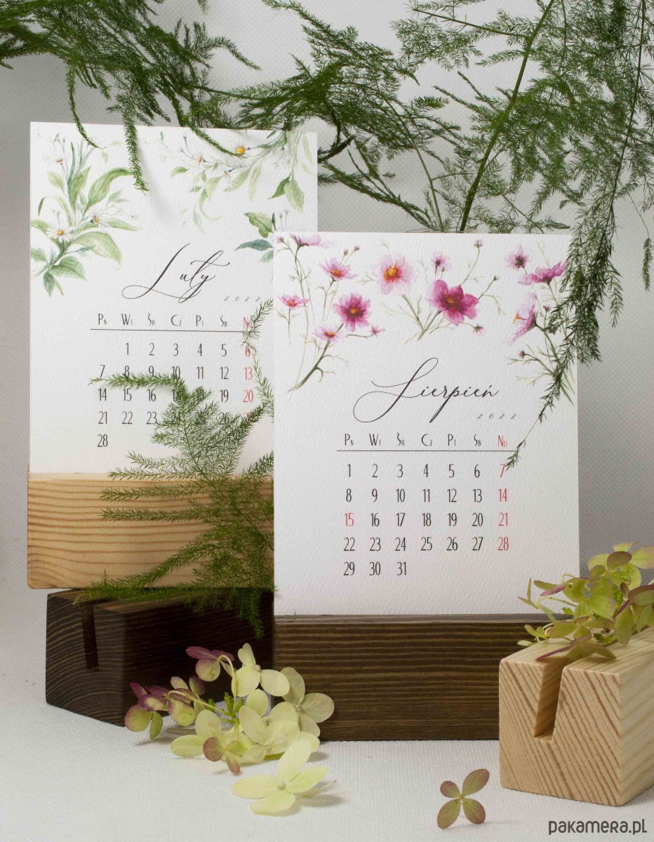 Kalendarz w formie 13 pojedynczych kart zdobionych ręcznie malowanymi kwiatowymi kompozycjami. Wydrukowany cyfrowo na fakturowanym papierze o gramaturze 300 g/m2. Drewniana podstawka w dwóch kolorach do wyboru. Podstawka zabezpieczona satynowym lakierem.