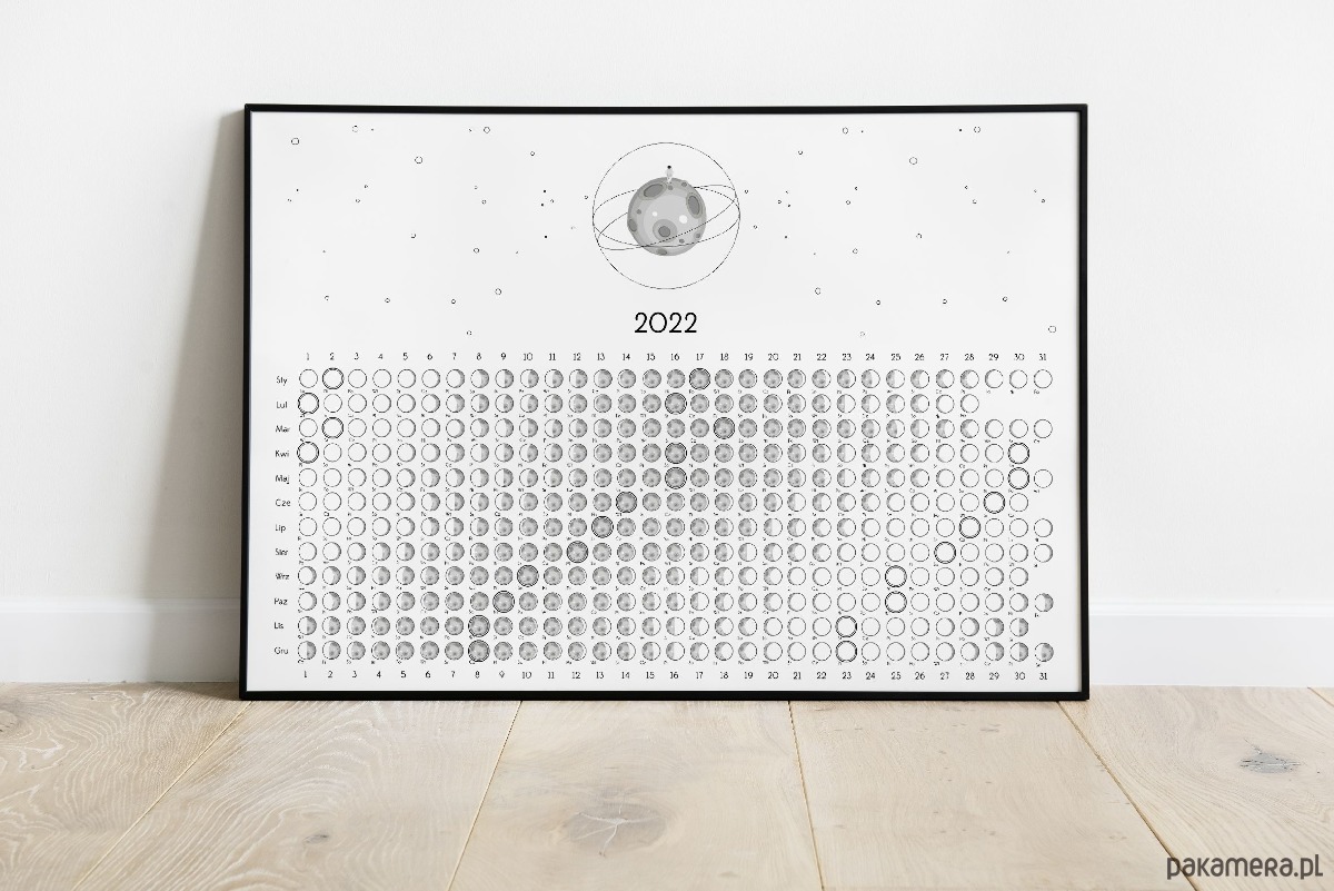 Kalendarz księżycowy narysowany przeze mnie i wydrukowany w wysokiej jakości na papierze min 200g. Format wydruku to A3. Wersja w polskiej wersji językowej lub angielskiej wersji językowej.