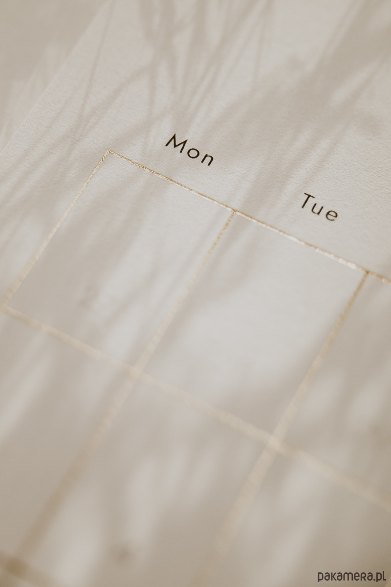 Kalendarz pomaga w planowaniu i organizacji, a do tego stanowi ozdobę otaczającej nas przestrzeni - wszystko dzięki złotej ramce wykonanej techniką hot stampingu. Pierwsza strona to prosty układ każdego miesiąca. Projekt przygotowałam tak, aby można było wpisać na stronie najważniejsze wydarzenia. Ważne spotkanie, urodziny przyjaciółki czy randkę można też zaznaczyć prostym symbolem, a na odwrocie zapisać dokładnie czego dotyczy wybrana data - właśnie po to przygotowane są wykropkowane linie :)