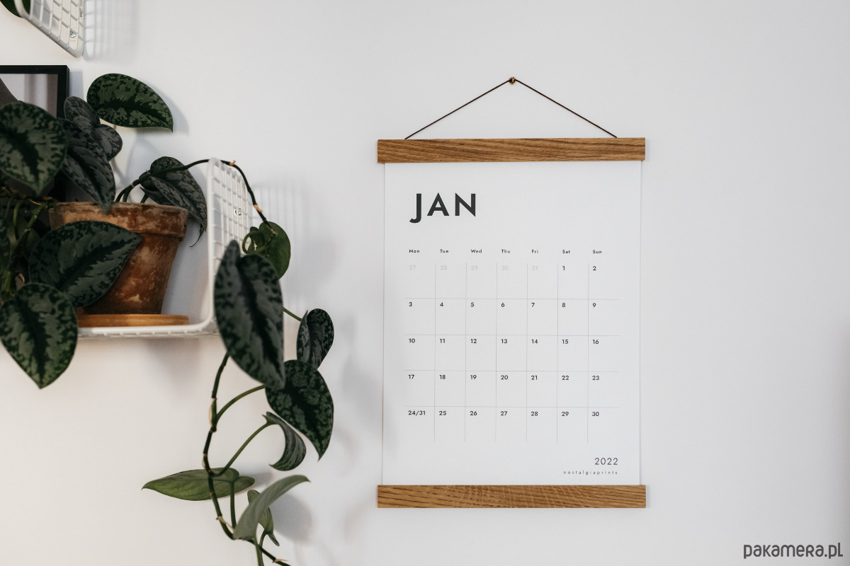 Składa się z 12 kart wydrukowanych na papierze z delikatną fakturą oraz drewnianego wieszaka. Karty z początkiem każdego miesiąca umieszczamy w listewkach. Wieszak wykonany został przeze mnie ręcznie z wysokiej jakości drewna dębowego. Silne magnesy umieszczone wewnątrz listewek mocno trzymają kartę kalendarza, nie pozwalając jednocześnie na jej uszkodzenie.