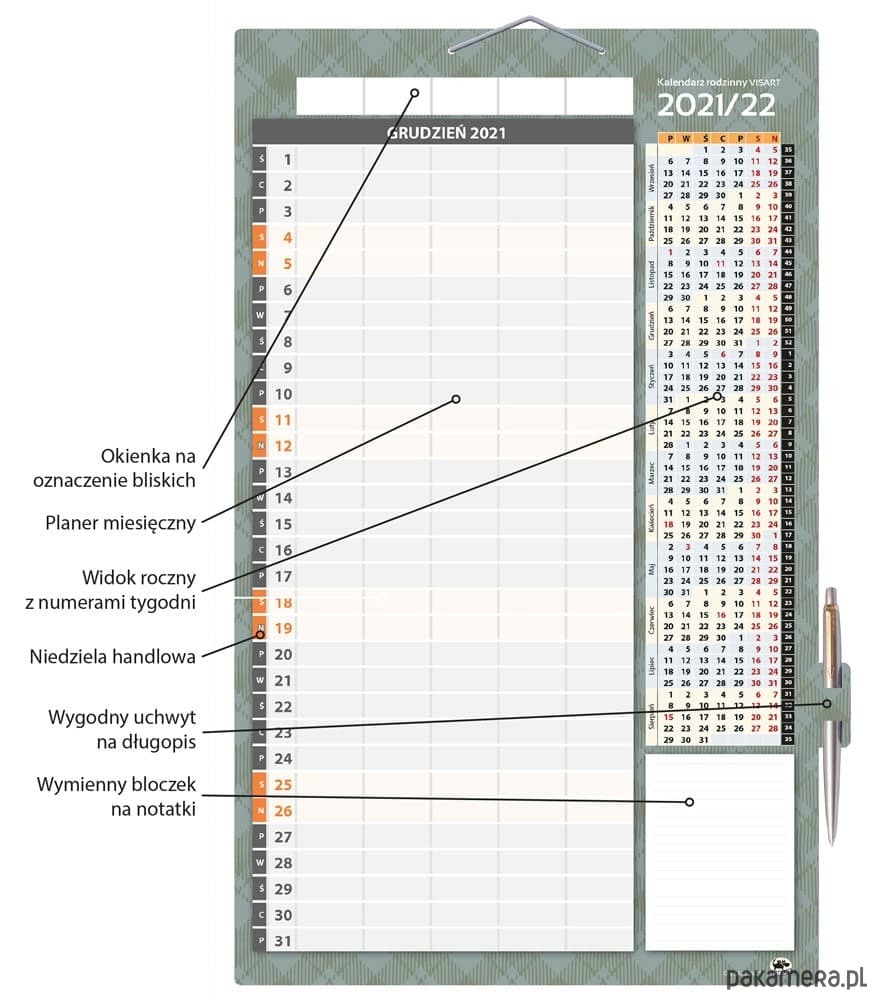 - Widok całego roku (na korpusie) z numeracją tygodni pozwalający na łatwe planowanie.
