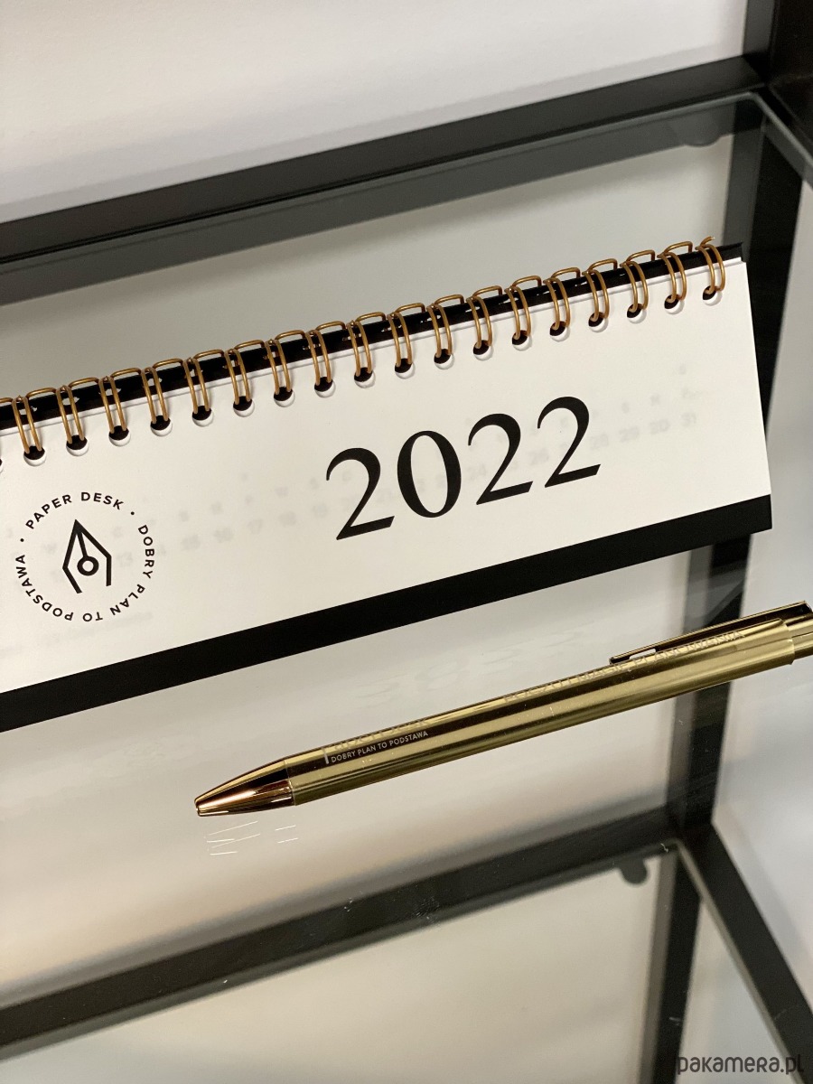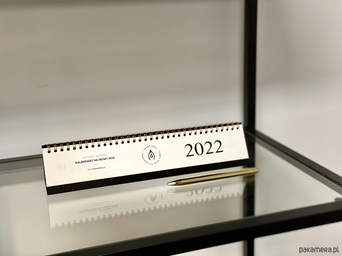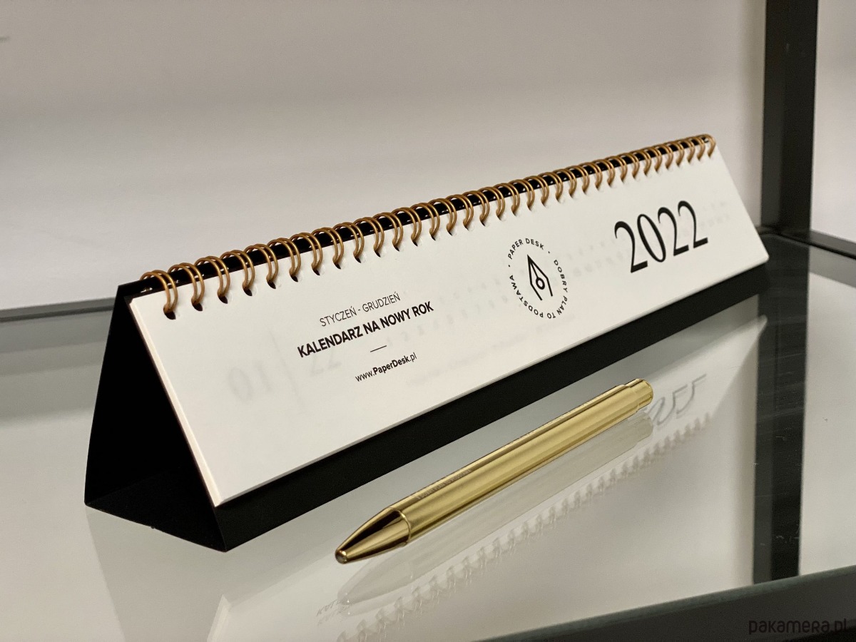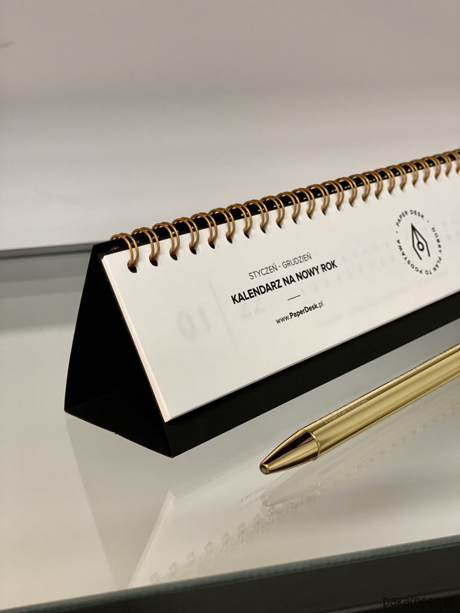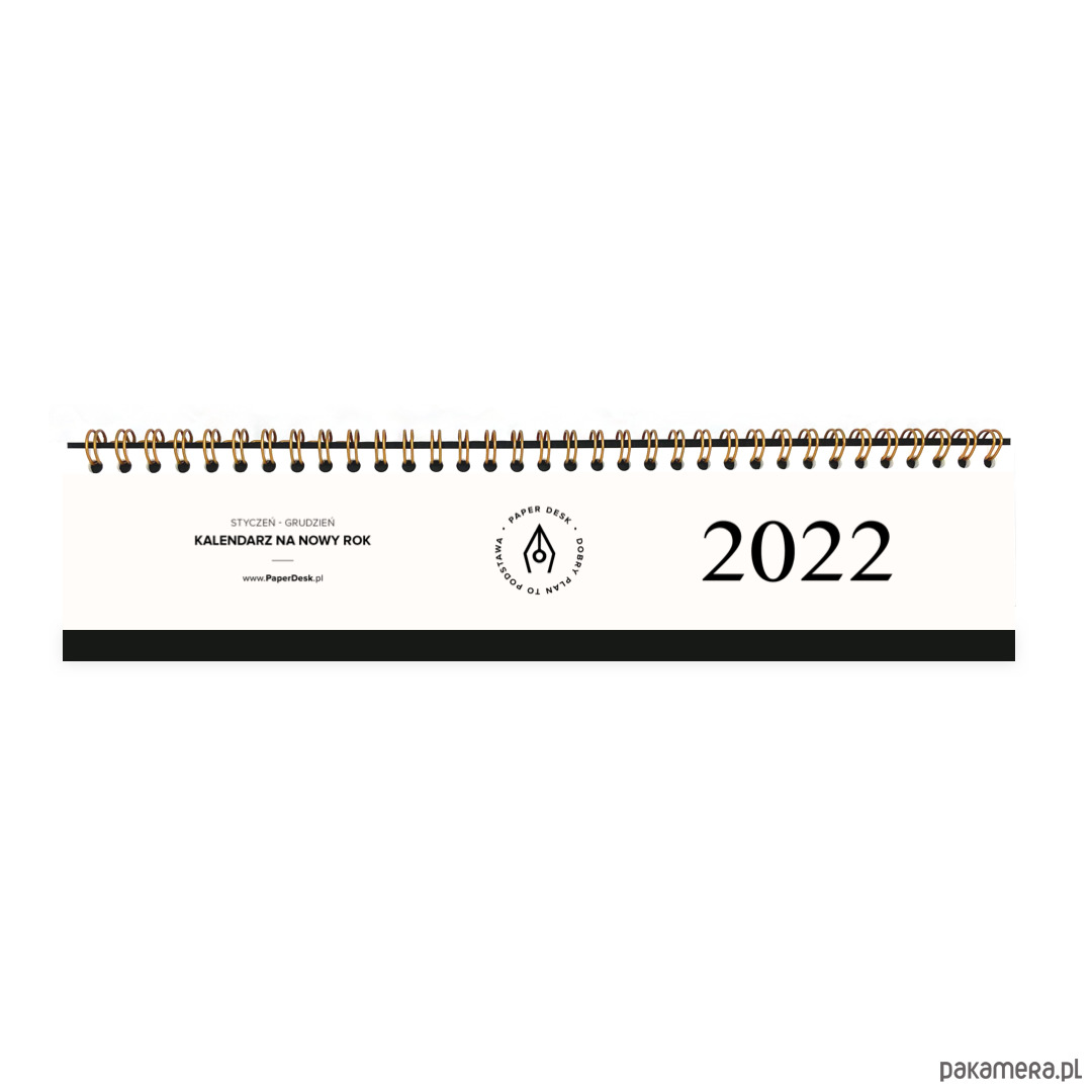 Elegancki roczny kalendarz biurkowy na złotej spirali z minimalistycznym designem.