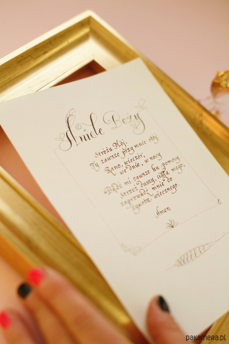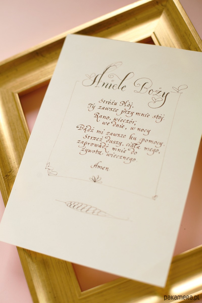 Modlitwa "Aniele Boży" wykaligrafowana ręcznie kawowym atramentem na francuskim papierze ekologicznym, pismem wzorowanym na kaligrafii z czasów renesansu.