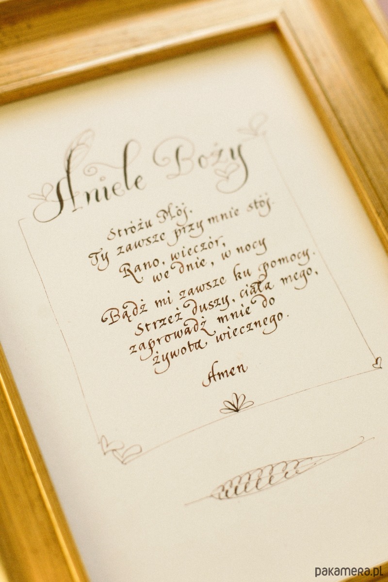 Kaligrafia: modlitwa "Aniele Boży" pisana atramentem