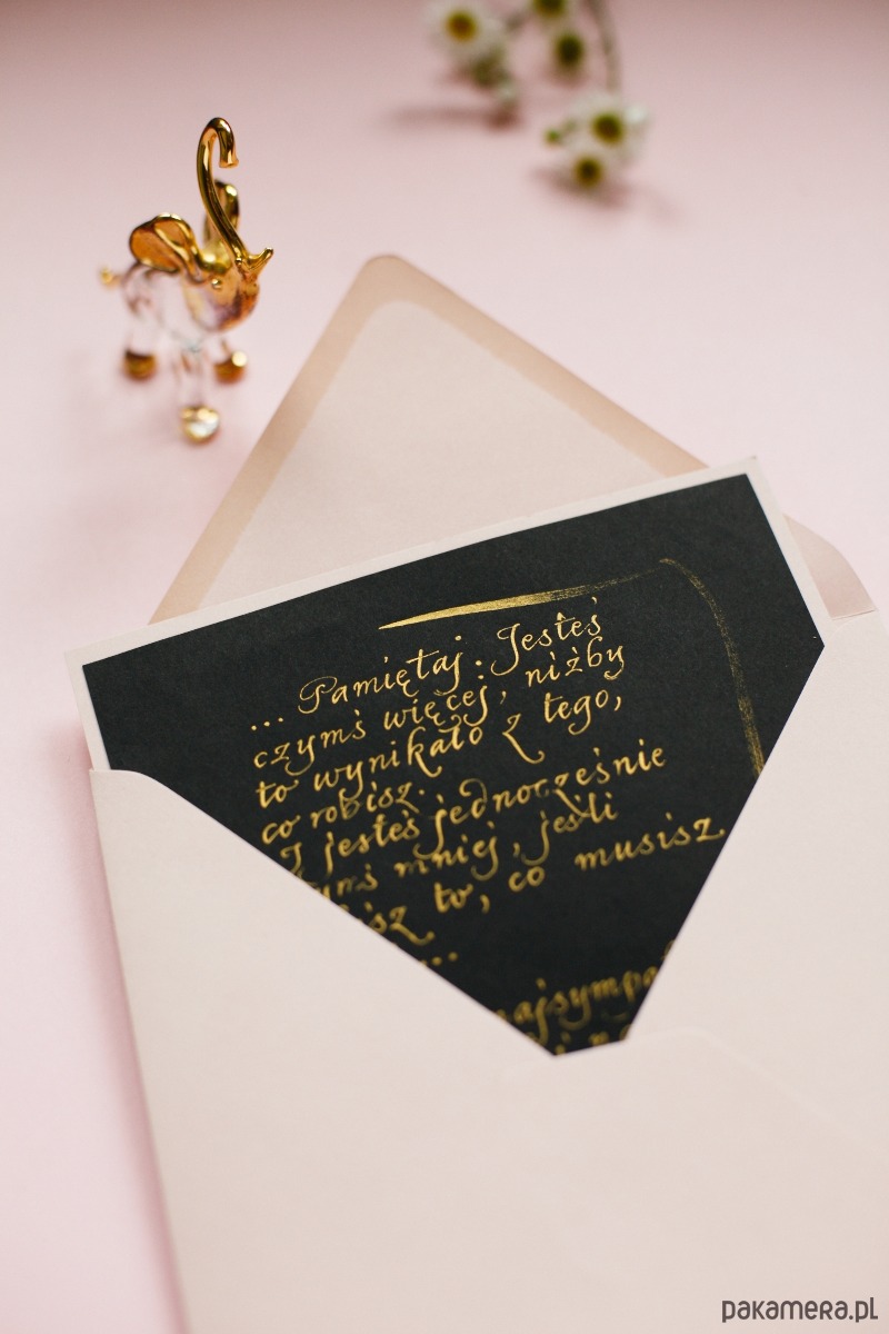 Bardzo proszę o wpisanie w uwagach do zamówienia (albo w wiadomości) treści, która ma zostać wykaligrafowana na kartce oraz na kopercie. Dziękuję :)