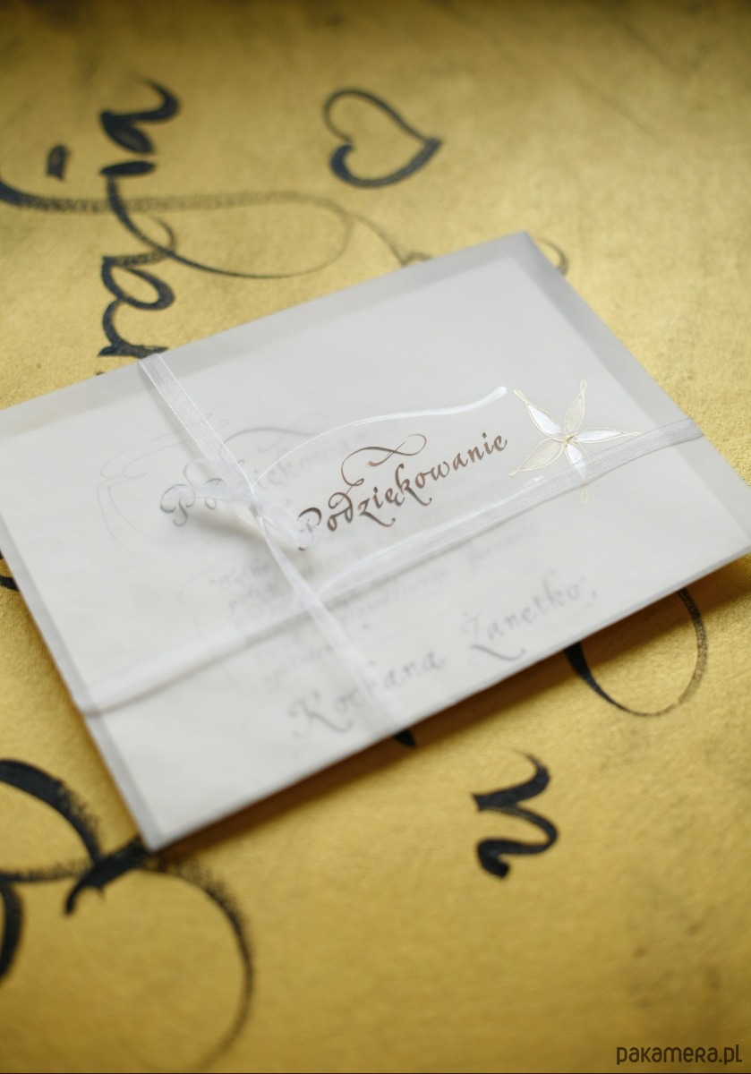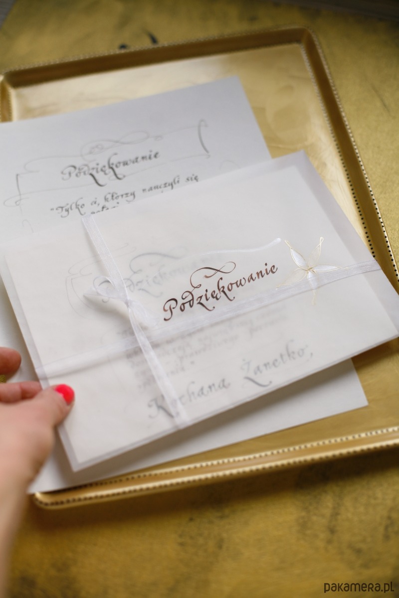 Personalizowane podziękowanie pisane atramentem. List wykonywany jest na zamówienie z nadzwyczajną dbałością, aby sprawił dużo radości i był piękną pamiątką :) Pisany kawowym atramentem eleganckim pismem wzorowanym na kaligrafii z czasów Leonarda, umieszczony w transparentnej kopercie z kalki. Przewinięty białą wstążką i ozdobiony ręcznie malowanym kwiatem.