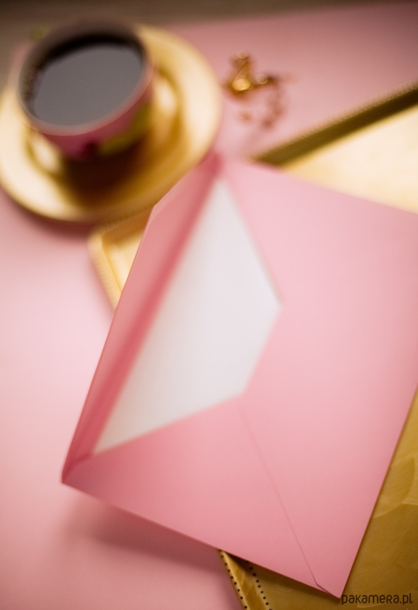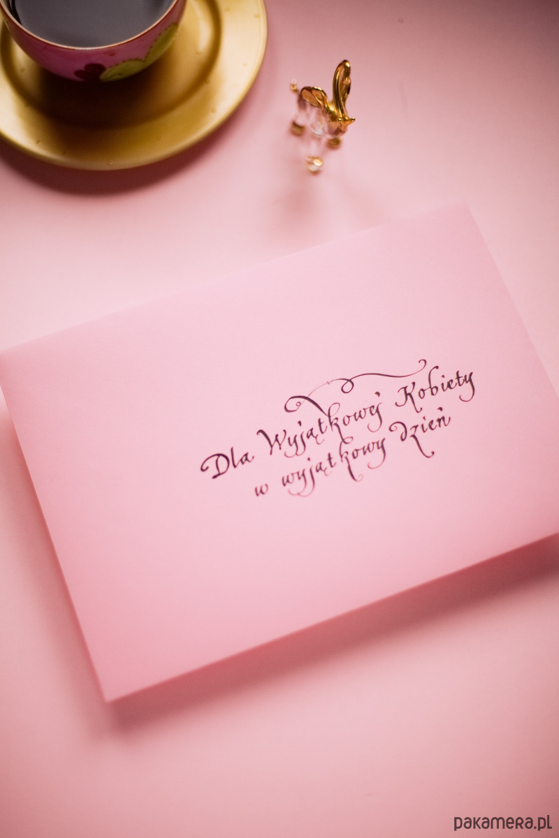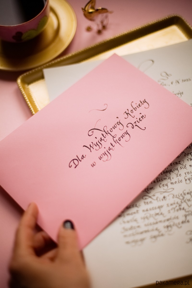 Pisany czarnym atramentem eleganckim pismem ręcznym, inspirowanym kaligrafią z czasów Leonarda. W komplecie duża koperta w kolorze różowym z najwyższej jakości włoskiego papieru ekologicznego.