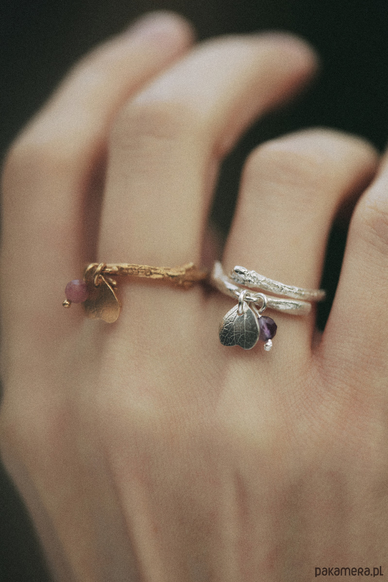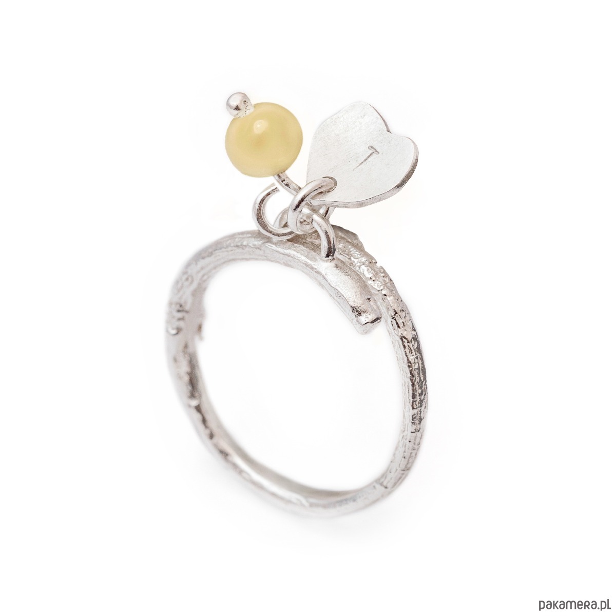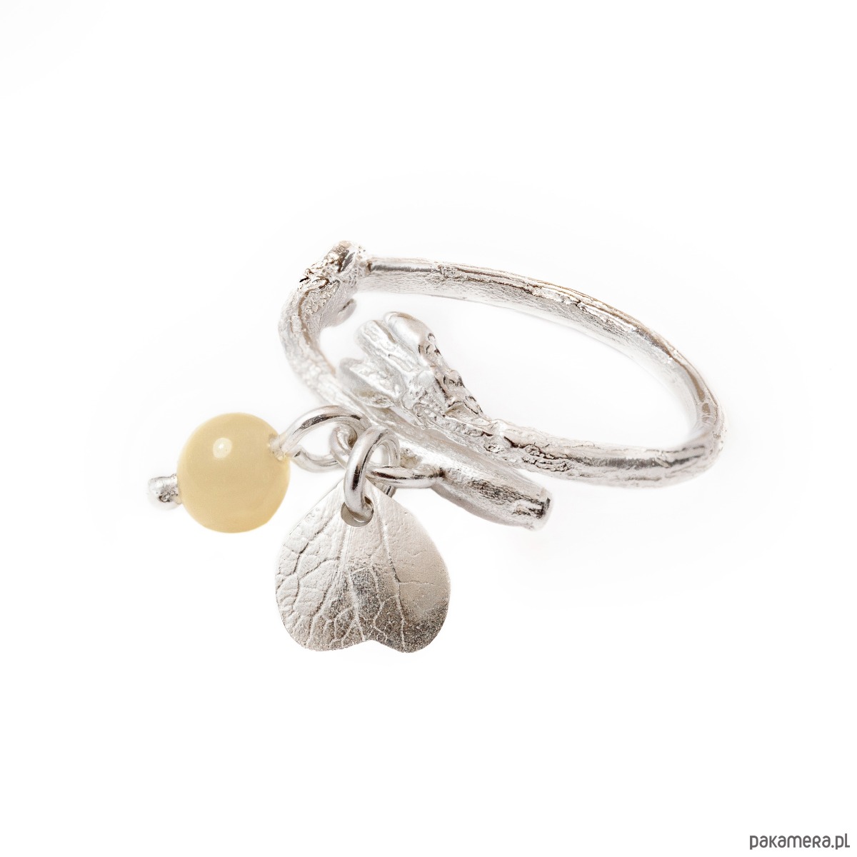 to oplatająca palec delikatna gałązka kaliny ( gałązki wybraliśmy z krzewu rosnącego w naszym ogrodzie :). Jest wyjątkowy przez ruszający się (jak listki na wietrze) płatek kaliny w kształcie serca i wybrany przez Ciebie kamień bądź bursztyn.