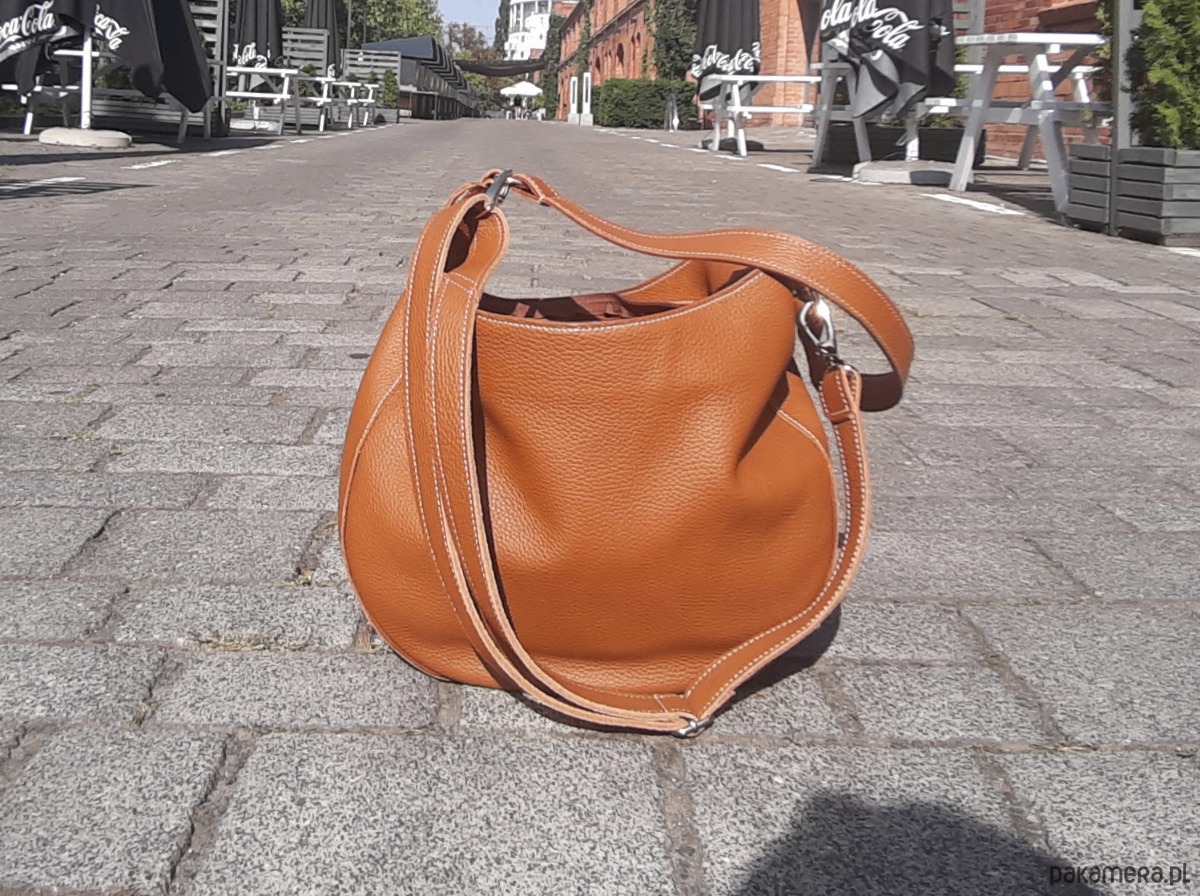 Miękka zaokrąglona torebka ze skóry maturalnej. Do noszenia na krótkim pasku ciasno na ramieniu lub na skos na regulowanym. Uszyta z niezwykle miękkiej brązowej skóry naturalnej. Cudowna na każdą porę roku.