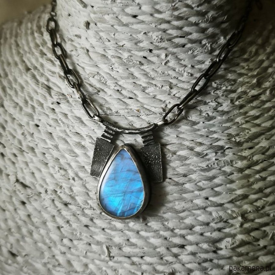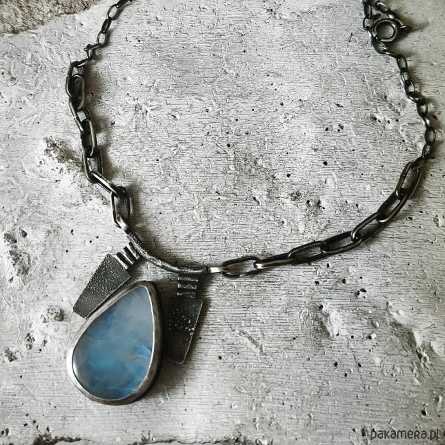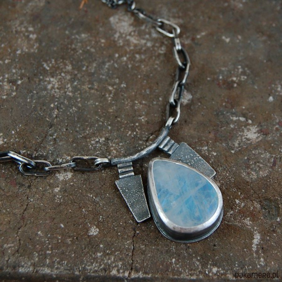 Srebrny naszyjnik z kamieniem księżycowym. Srebro oksydowane, przetarte. Wielkość kamienia 2 x 3 cm. Długość naszyjnika 47 cm.