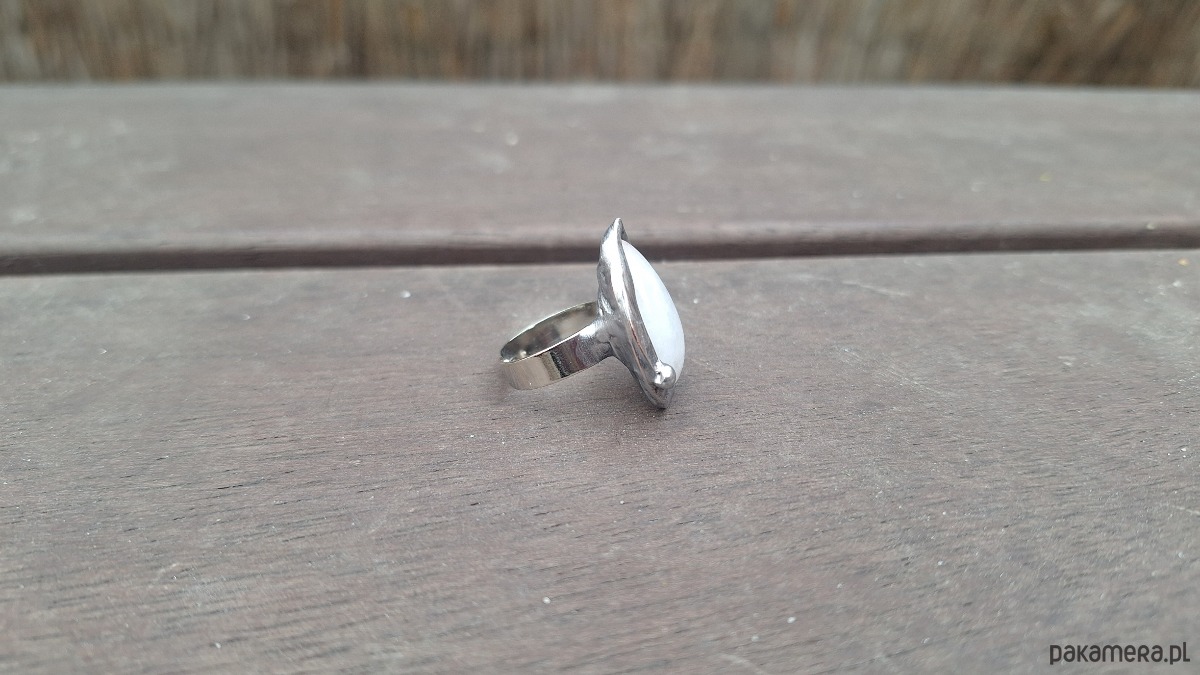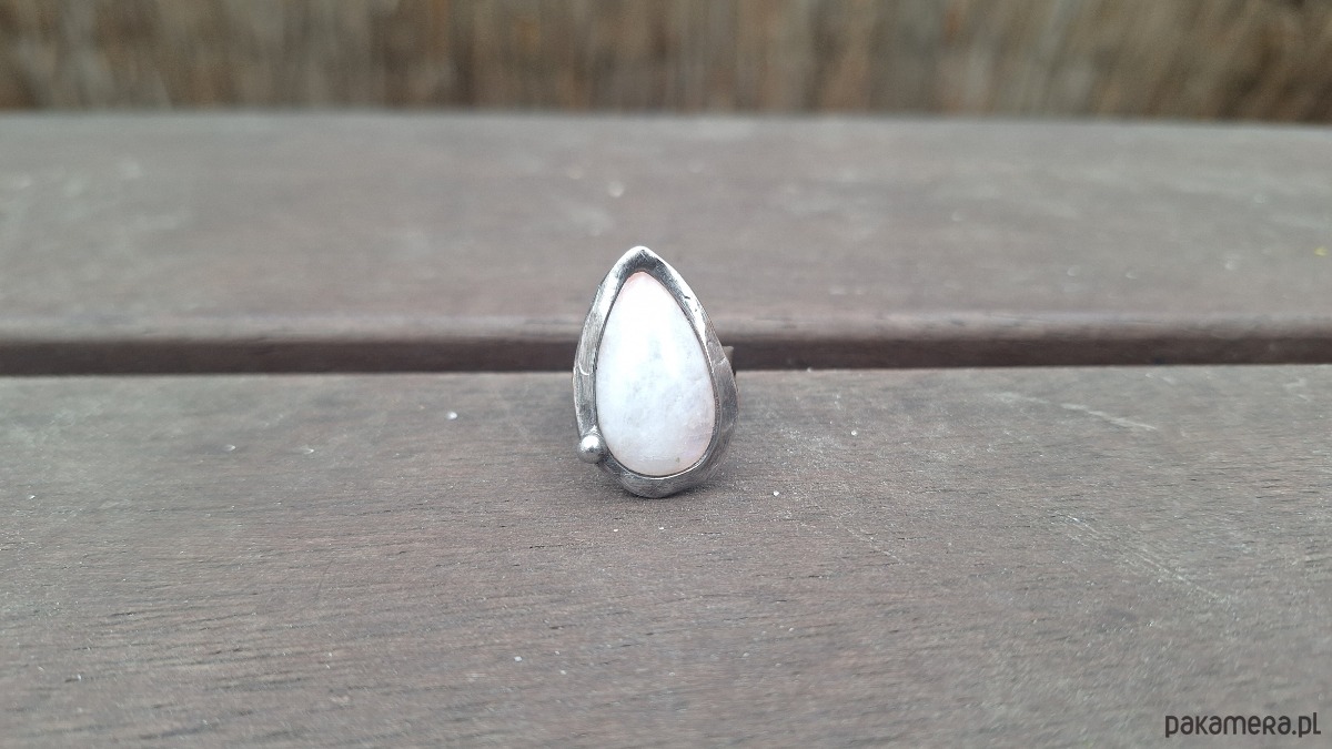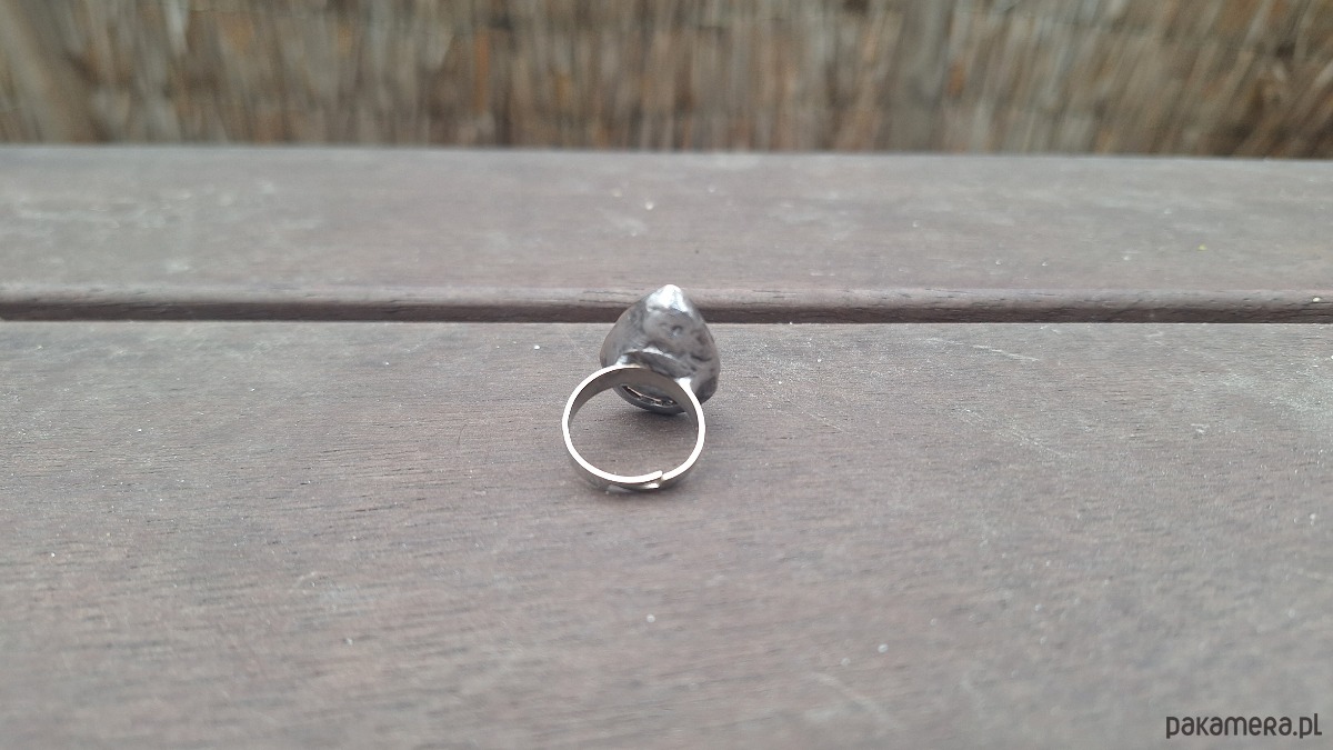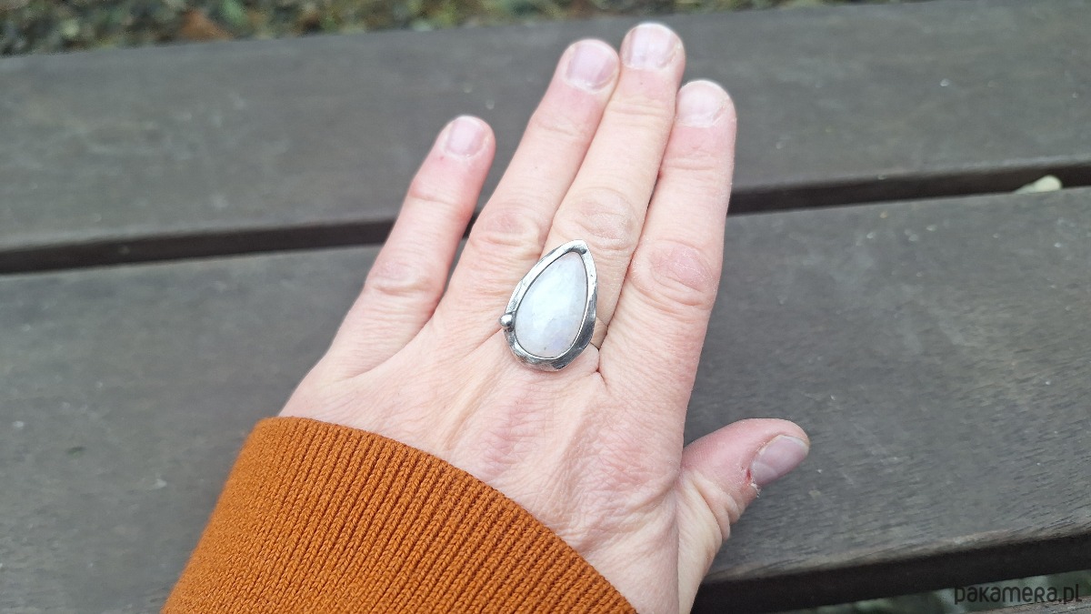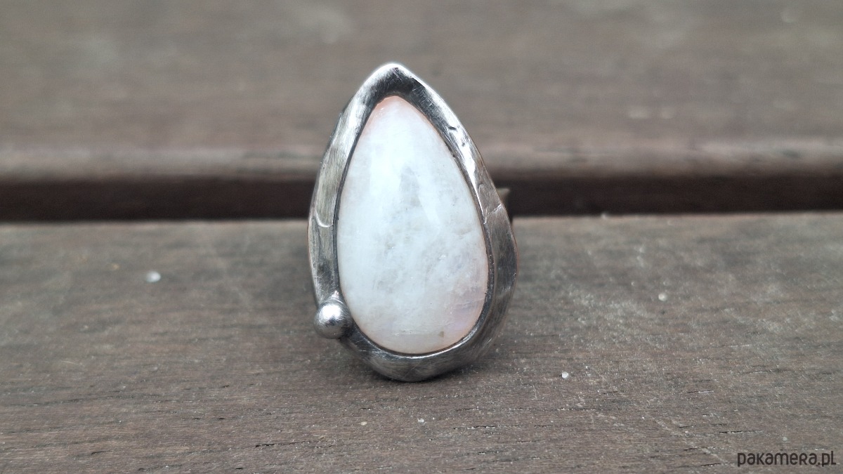 Pierścionek wykonany z miedzi, cyny i naturalnego kamienia księżycowego. Wymiary ok. 2.3 na 1.6 cm. Regulowany. Nie jest ciężki.