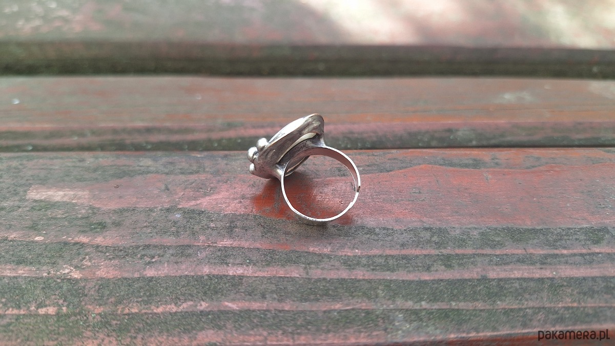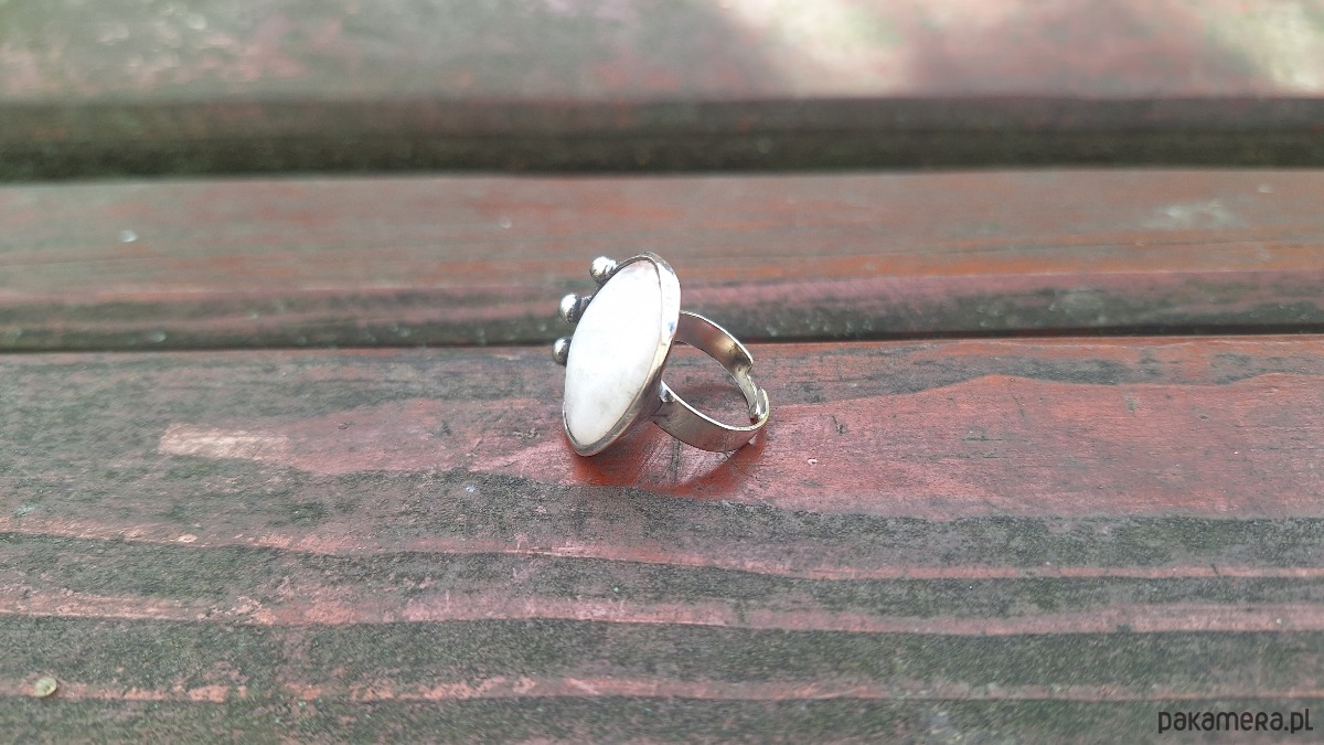 Pierścionek wykonany z miedzi, cyny i naturalnego kamienia księżycowego. Wymiary ok. 2.3 na 1.8 cm. Regulowany. Nie jest ciężki.