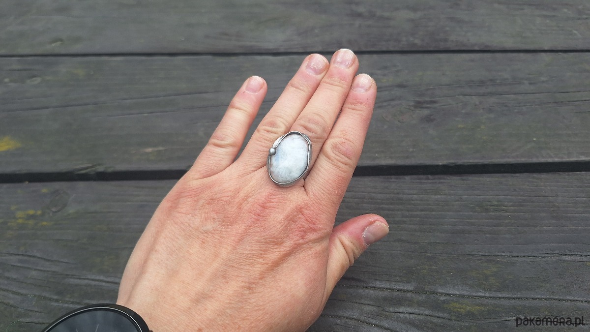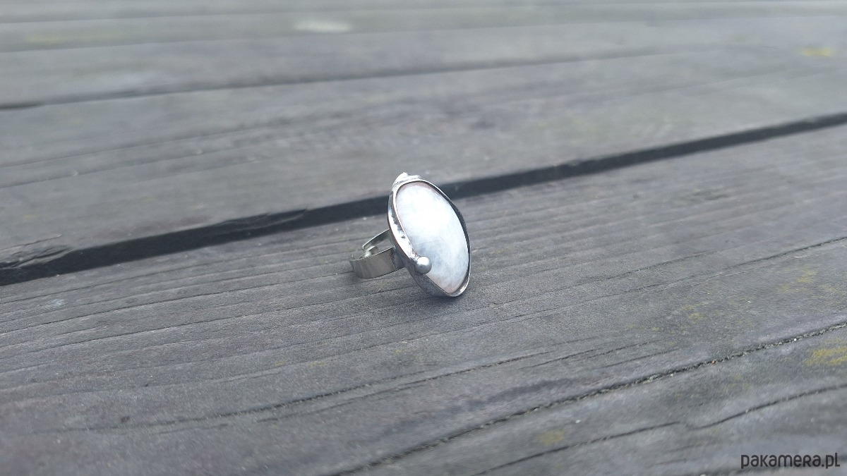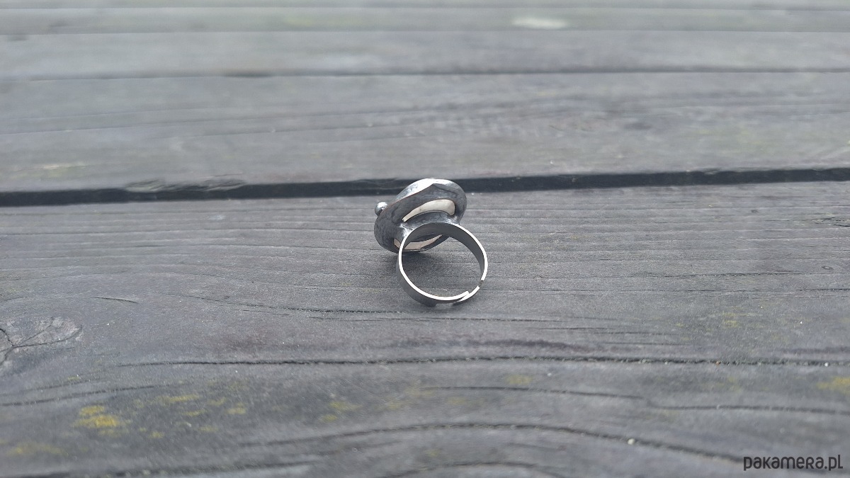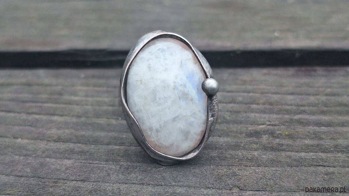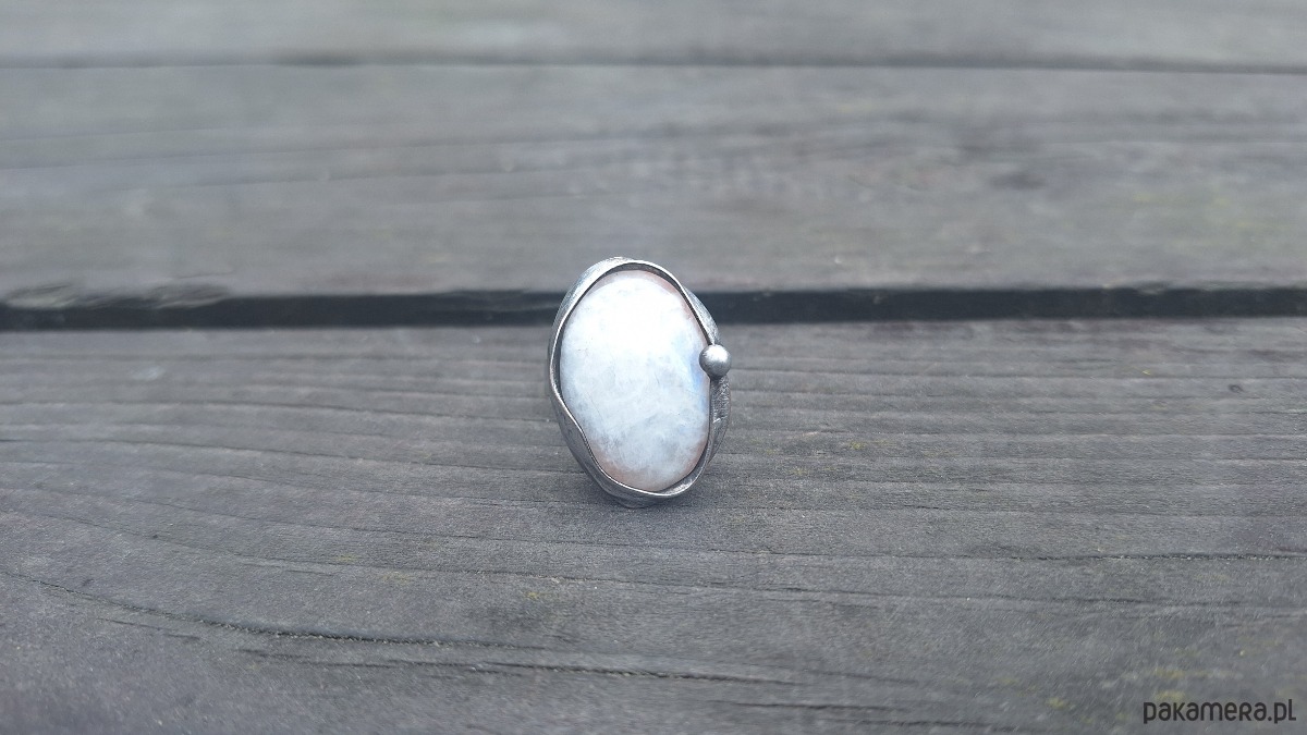 Pierścionek wykonany z miedzi, cyny i naturalnego kamienia księżycowego. Wymiary ok. 2.7 na 2 cm. Regulowany. Nie jest ciężki.