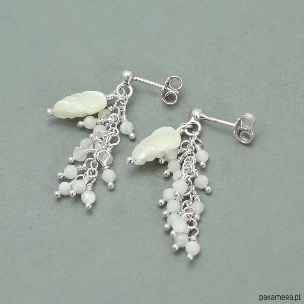 Kamienie: kamień księżycowy - fasetowane kulki (3mm); listki z masy perłowej (12x9mm)