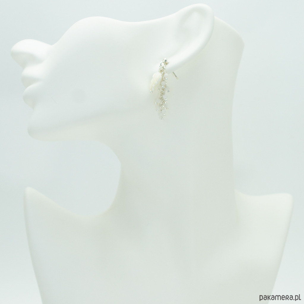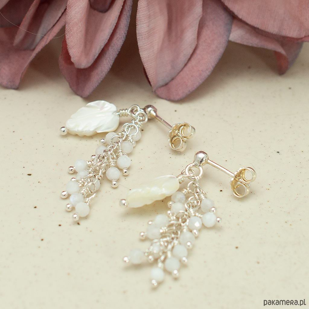 Eleganckie, drobne kolczyki gronka wykonane ze srebra próby 925, z naturalnym kamieniem księżycowym w kolorze białym i listkami z masy perłowej. Subtelna biżuteria dla osób lubiących ponadczasowe, klasyczne wzornictwo. Lekkie, idealne do noszenia na co dzień. Wygodne bigle - sztyfty dobrze trzymają się na uszach. Polecam.