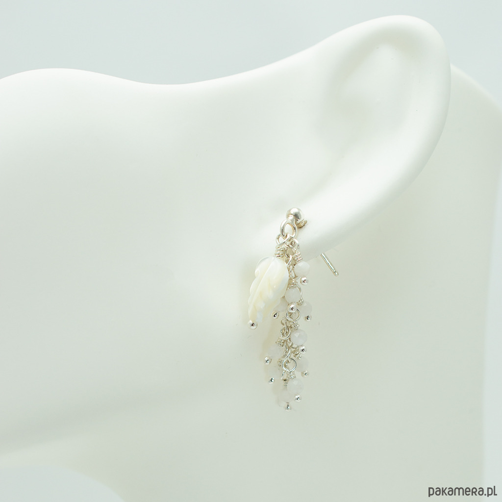 Kamień księżycowy, srebro 925, białe kolczyki, gronka, listek, RĘKODZIEŁO