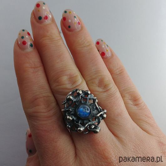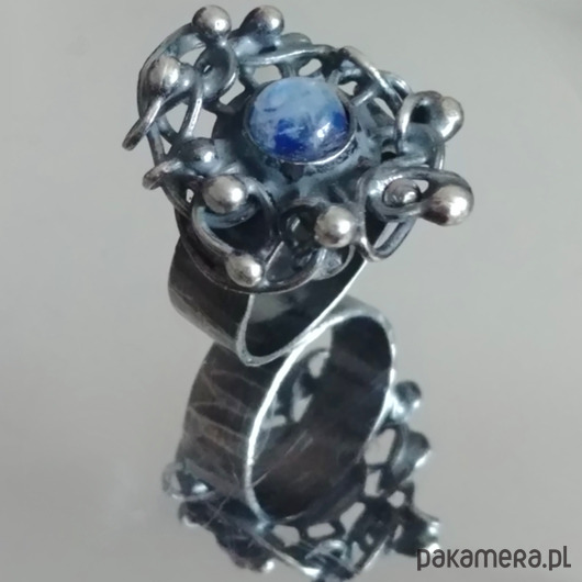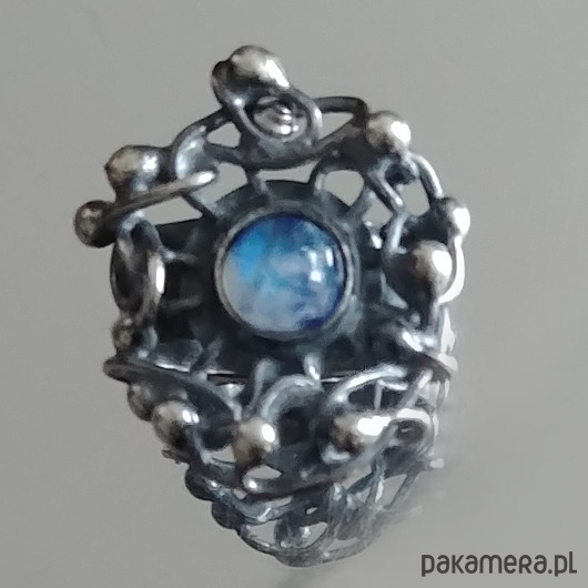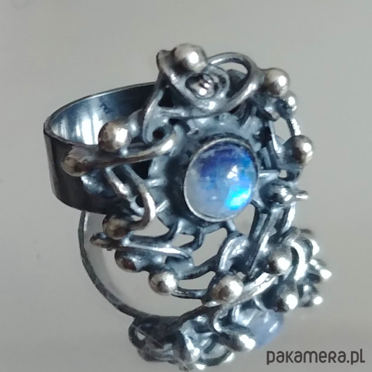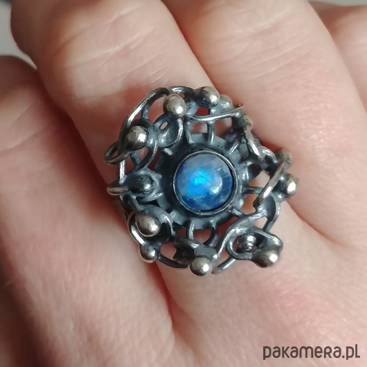 Pierścionek z własnoręcznie zakutym w srebro pr.925 naturalnym kamieniem księżycowym o średnicy 7 mm. Wymiary oprawy kamienia 25 x 23 mm, rozmiar jubilerski 17, mogę powiększyć na max. 20. Obrączka młotkowana, oksydowana, ma 8 mm szerokości. Waga 10,5 g. Pierścień zapakowany w ozdobne pudełeczko.