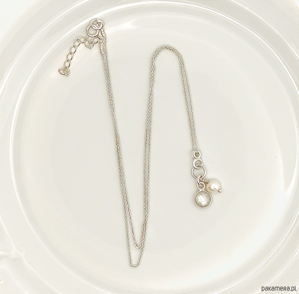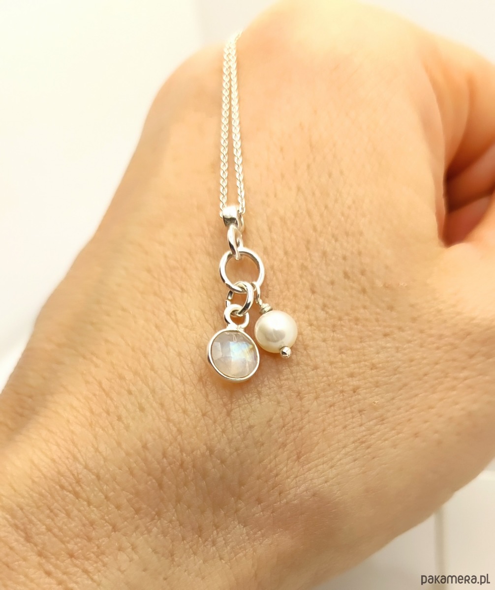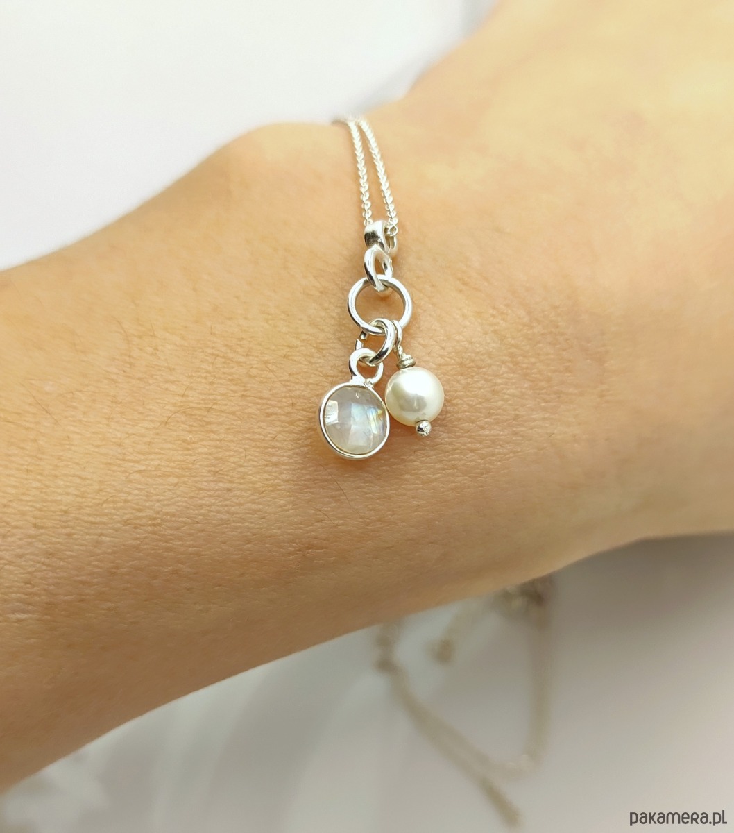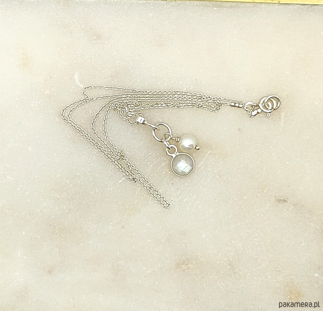 Naszyjnik z uroczą zawieszką. Na kółeczku znajdują się dwa elementy: perełka oraz kamień księżycowy w srebrnym okuciu. Zawieszone na delikatnym łańcuszku stanowią uniwersalną ozdobę, dla każdej kobiety, na wszelkie okoliczności.