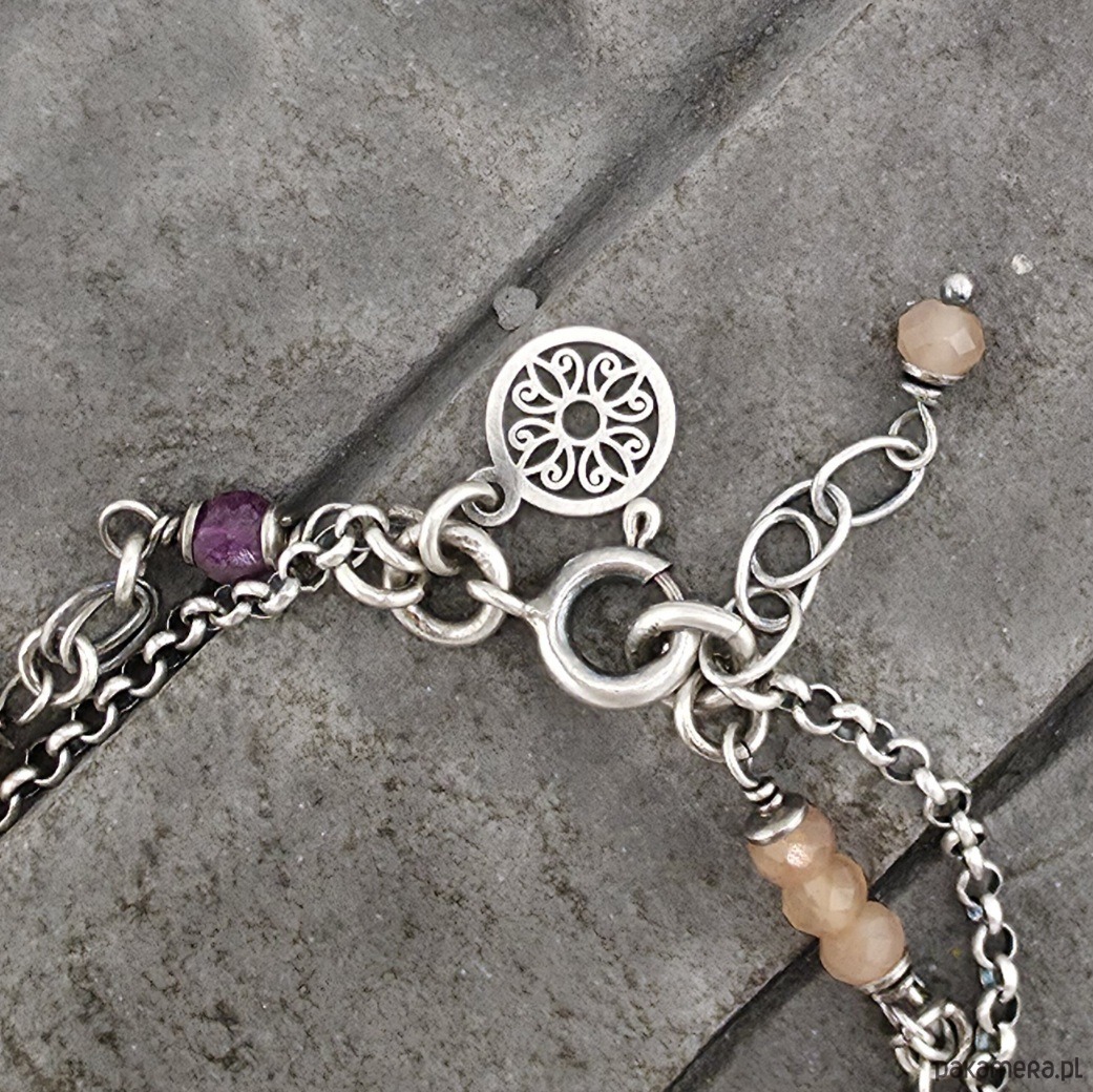 Delikatna, kobieca i wyjątkowa bransoletka na co dzień i nie tylko. Wykonana w całości z oksydowanego srebra próby 925 oraz fasetowanyxh pastylek rubinu i fasetowanych oponek kamienia słonecznego wielkości ok. 4 mm. Całkowita długość bransoletki regulowana od 19 cm do 20,5 cm. Ozdobnie zapakowana.