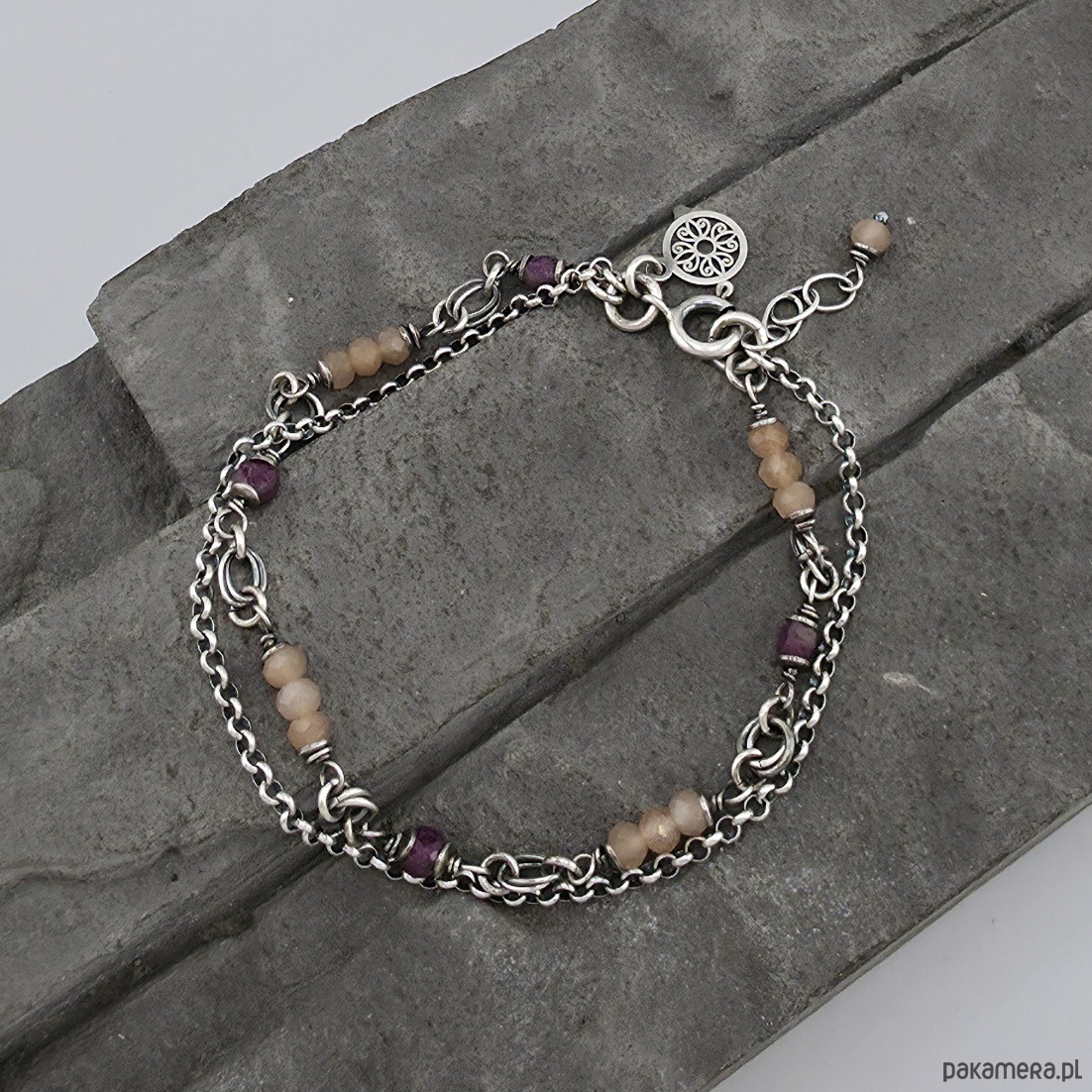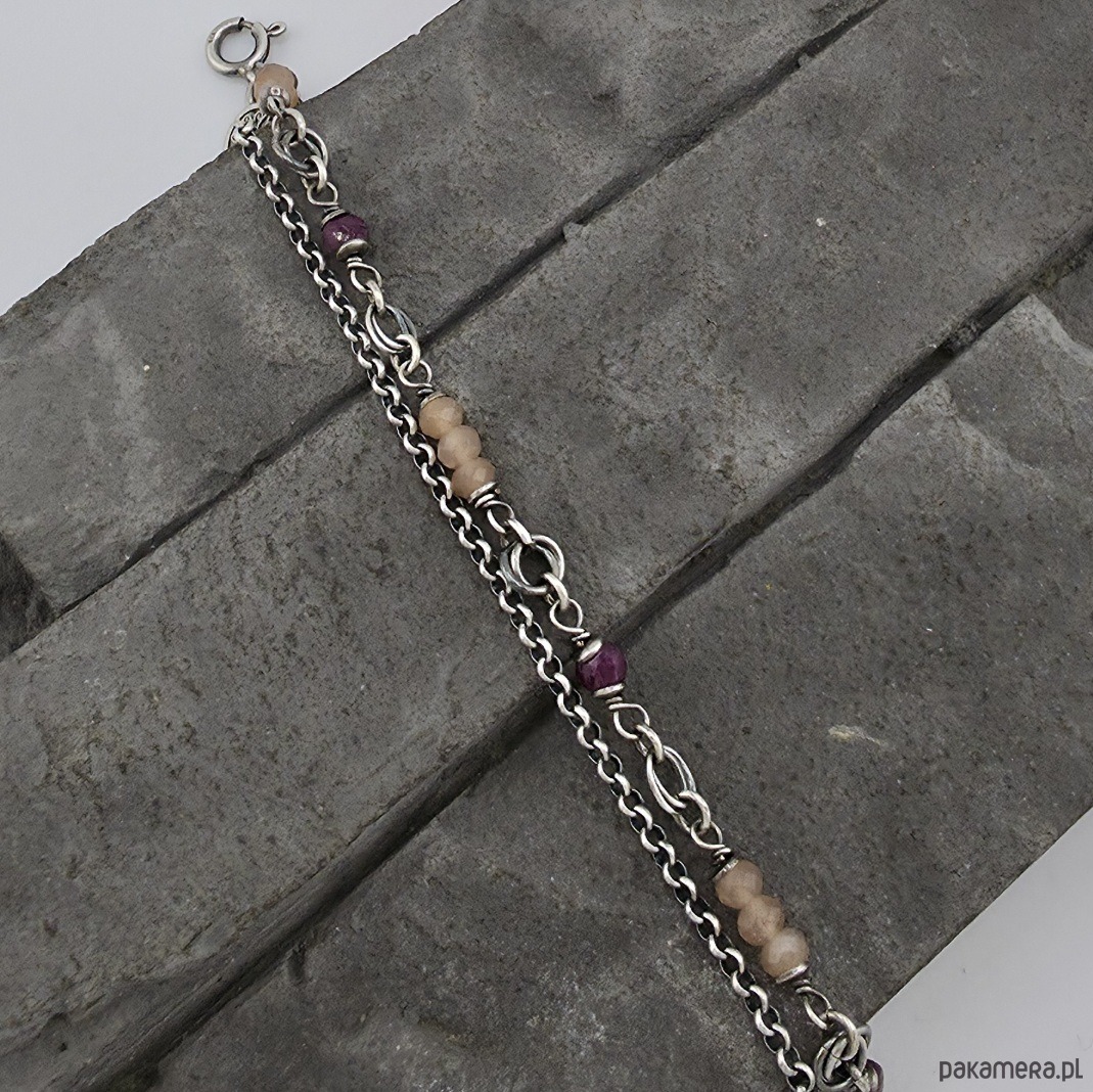 Delikatna, kobieca i wyjątkowa bransoletka na co dzień i nie tylko. Wykonana w całości z oksydowanego srebra próby 925 oraz fasetowanyxh pastylek rubinu i fasetowanych oponek kamienia słonecznego wielkości ok. 4 mm. Całkowita długość bransoletki regulowana od 19 cm do 20,5 cm. Ozdobnie zapakowana.