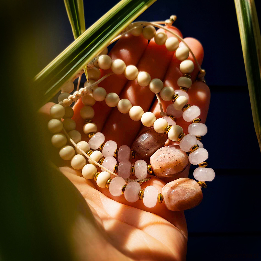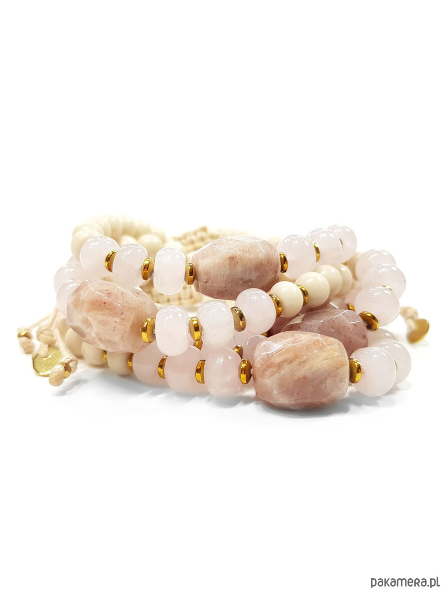 Bransoletka wykonana z kamienia słonecznego, kwarcu różowego, kamienia rzecznego i hematytu oraz mocnego sznureczka. Bransoletka będzie odpowiednia na nadgarstek o obwodzie 14,5-16,5 cm.