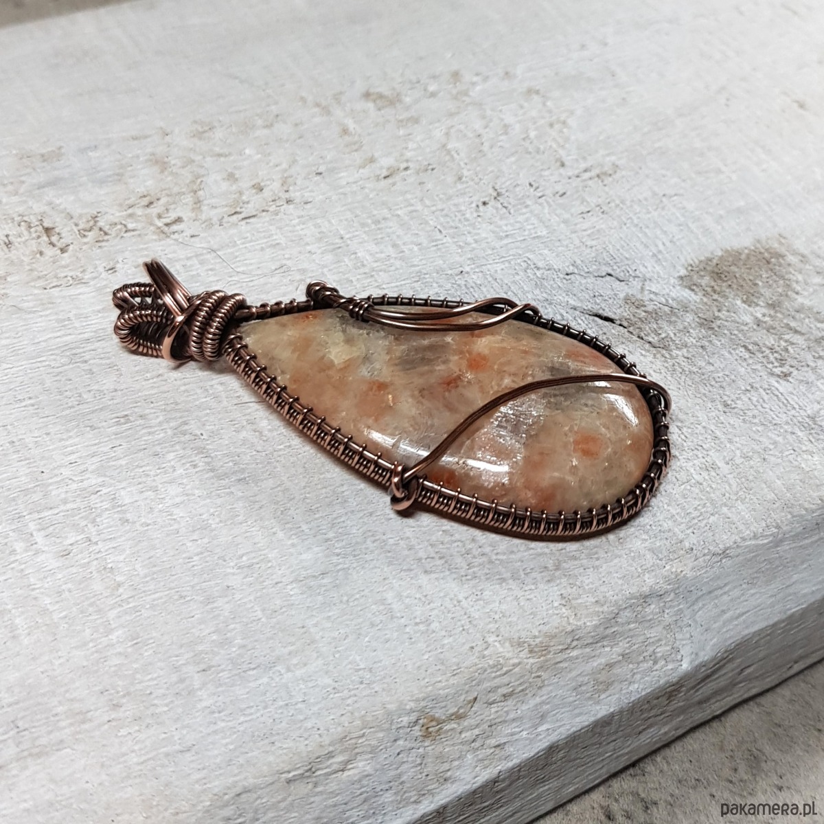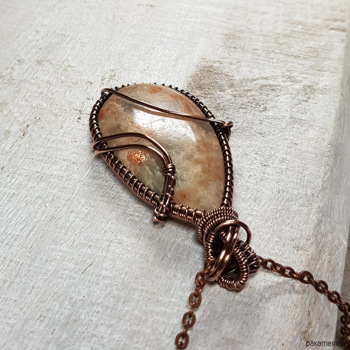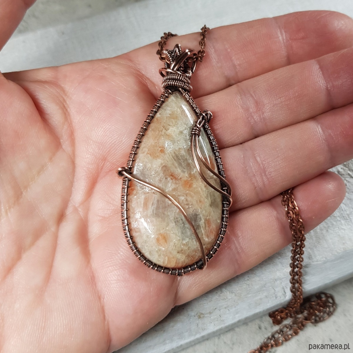 Zawieszka wykonana ręcznie metodą wire-wrappingu której głównym elementem jest naturalny kamień słoneczny w kolorze pomarańczu, beżu, złotego, gdzieniegdzie połyskujący drobinkami przypominającymi brokat. Wisiorek wykonany jest w miedzi, którą następnie zaoksydowałam i wypolerowałam w celu uzyskania efektu szlachetnego postarzenia. Wymiary zawieszki 63x340m z łańcuszkiem długości około 48-50 cm. Wisiorek jest delikatny, skromny, elegancki.