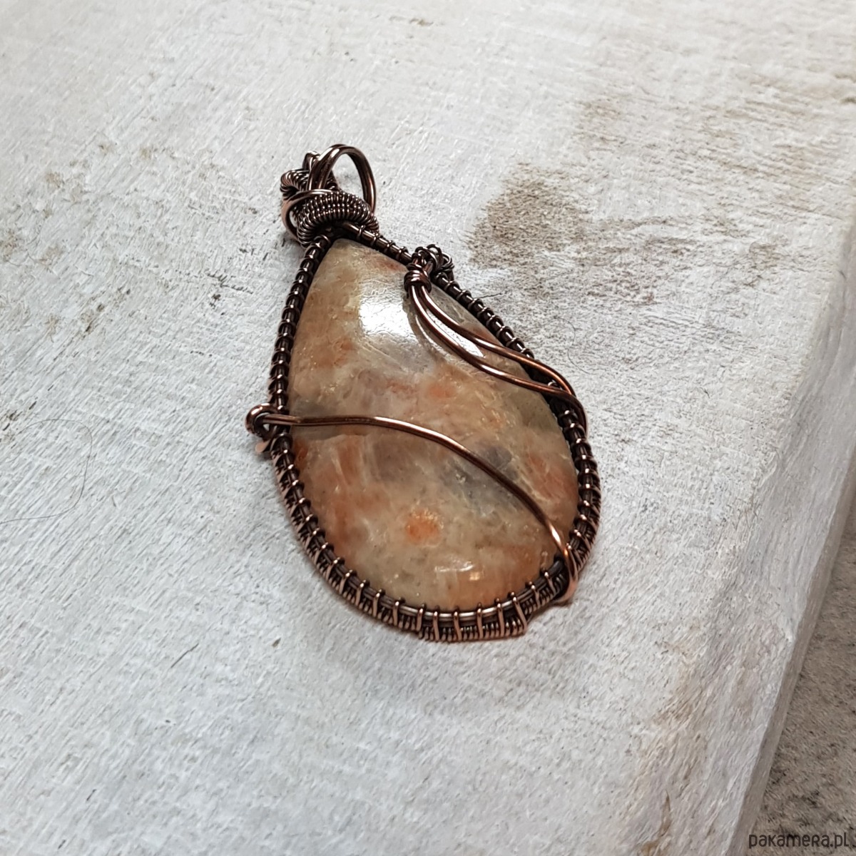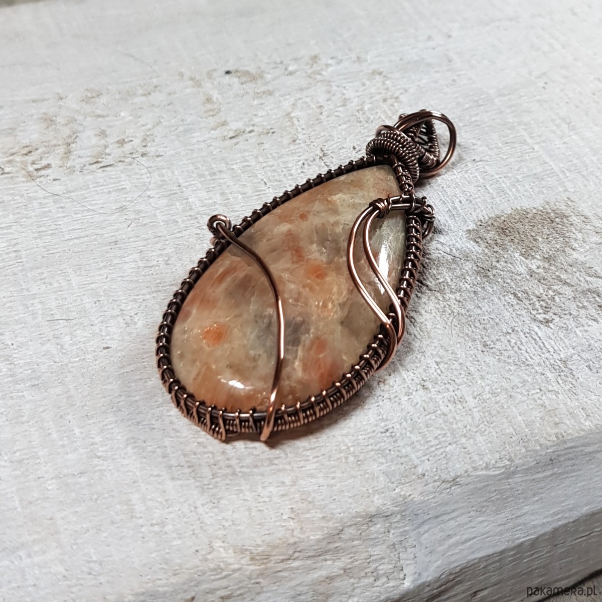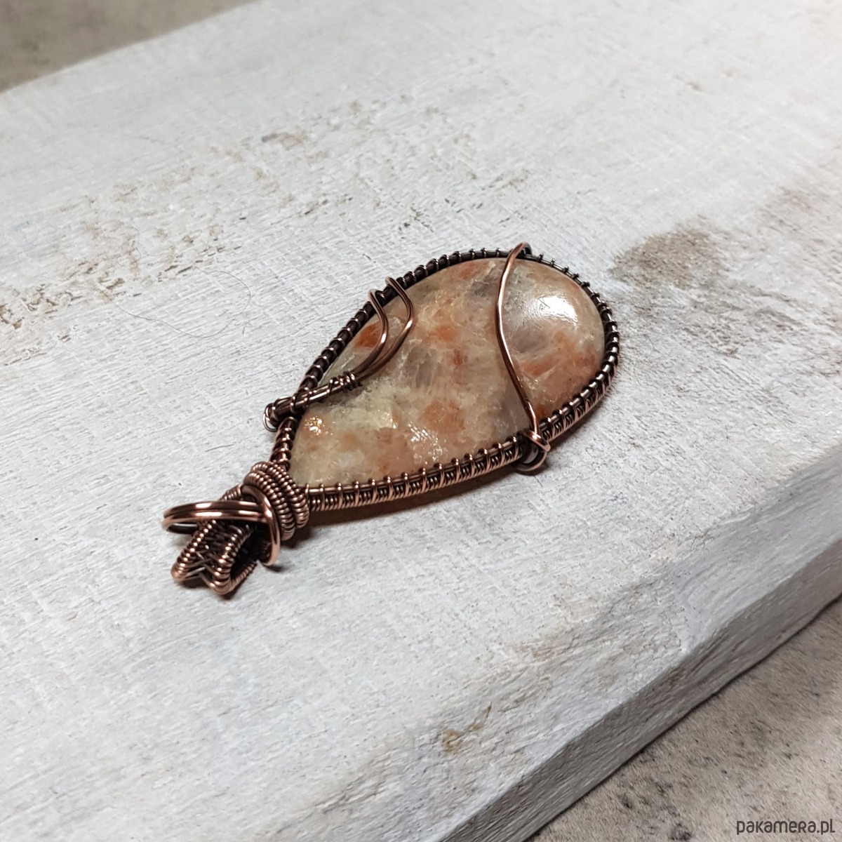 Zawieszka wykonana ręcznie metodą wire-wrappingu której głównym elementem jest naturalny kamień słoneczny w kolorze pomarańczu, beżu, złotego, gdzieniegdzie połyskujący drobinkami przypominającymi brokat. Wisiorek wykonany jest w miedzi, którą następnie zaoksydowałam i wypolerowałam w celu uzyskania efektu szlachetnego postarzenia. Wymiary zawieszki 63x340m z łańcuszkiem długości około 48-50 cm. Wisiorek jest delikatny, skromny, elegancki.
