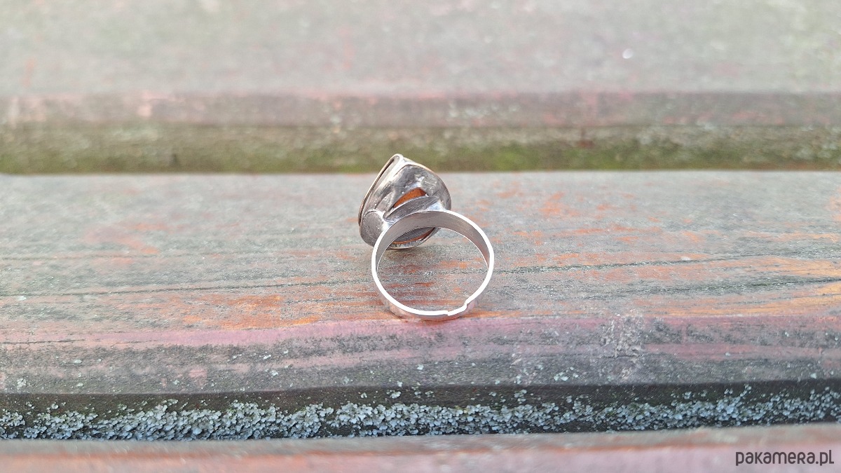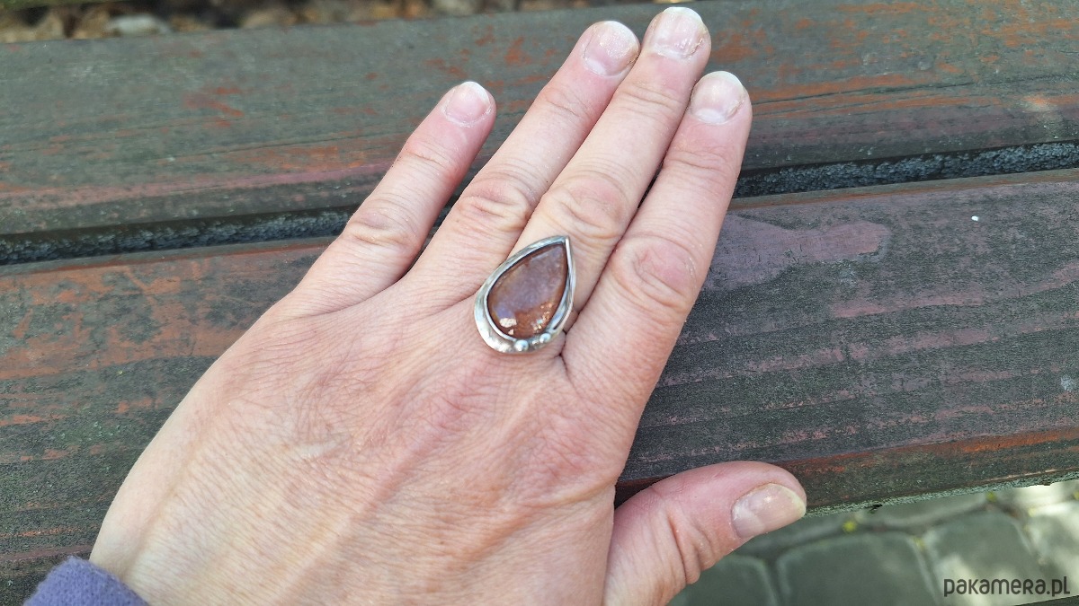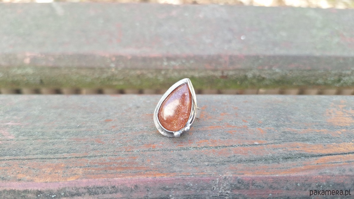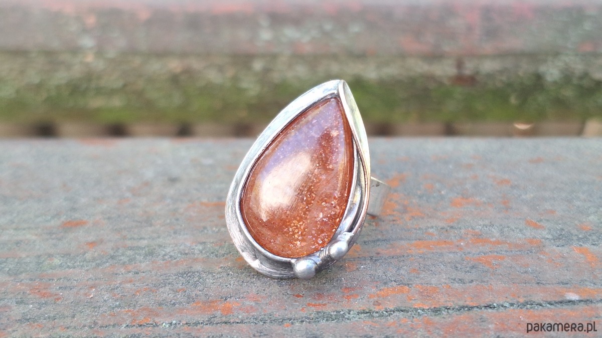 Pierścionek wykonany z miedzi, cyny i naturalnego kamienia słonecznego. Wymiary ok. 2.3 na 1.6 cm. Regulowany. Nie jest ciężki.