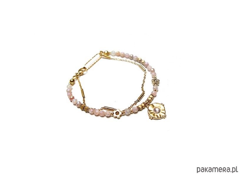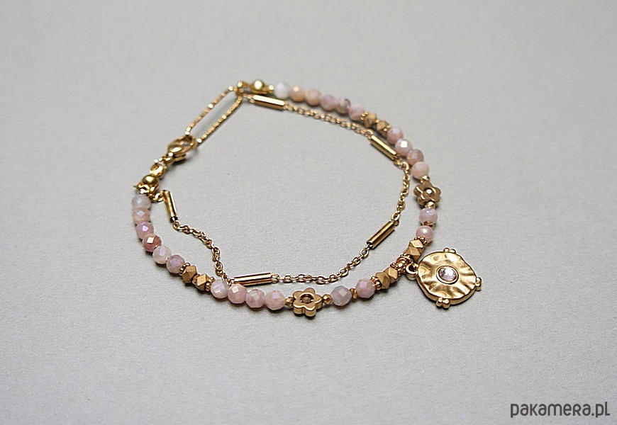 Delikatna bransoletka wykonana w całości z pozłacanej stali szlachetnej, naturalnych kamieni - kamień słoneczny galwanizowany [3mm], przekładek z hematytu [1mm, 3 x 2mm oraz 6mm - kwiatki] oraz zawieszki z kryształkiem Swaroski. Całkowita długość bransoletki: 19cm. Biżuteria ozdobnie zapakowana.