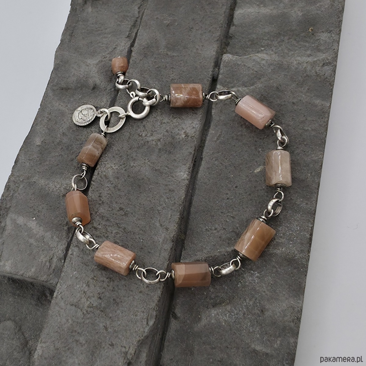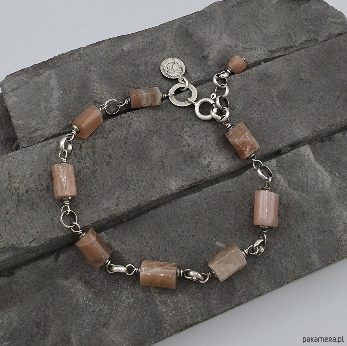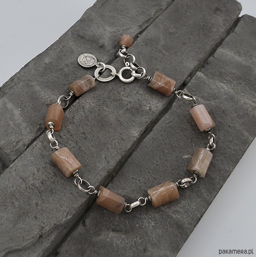 Kobieca i wyjątkowa bransoletka na co dzień i nie tylko. Wykonana w całości z oksydowanego srebra próby 925 oraz ciosanych walców kamienia słonecznego .wielkości ok. 9-10 mm x 6-7 mm. Przy zapieciu zawieszka - srebrna moneta. Całkowita długość bransoletki regulowana od 19 cm do 21 cm. W mojej galerii kolczyki do kompletu. Na życzenie moge długość bransoletki zmienić lub wykonac z innymi kamieniami. Ozdobnie zapakowana.