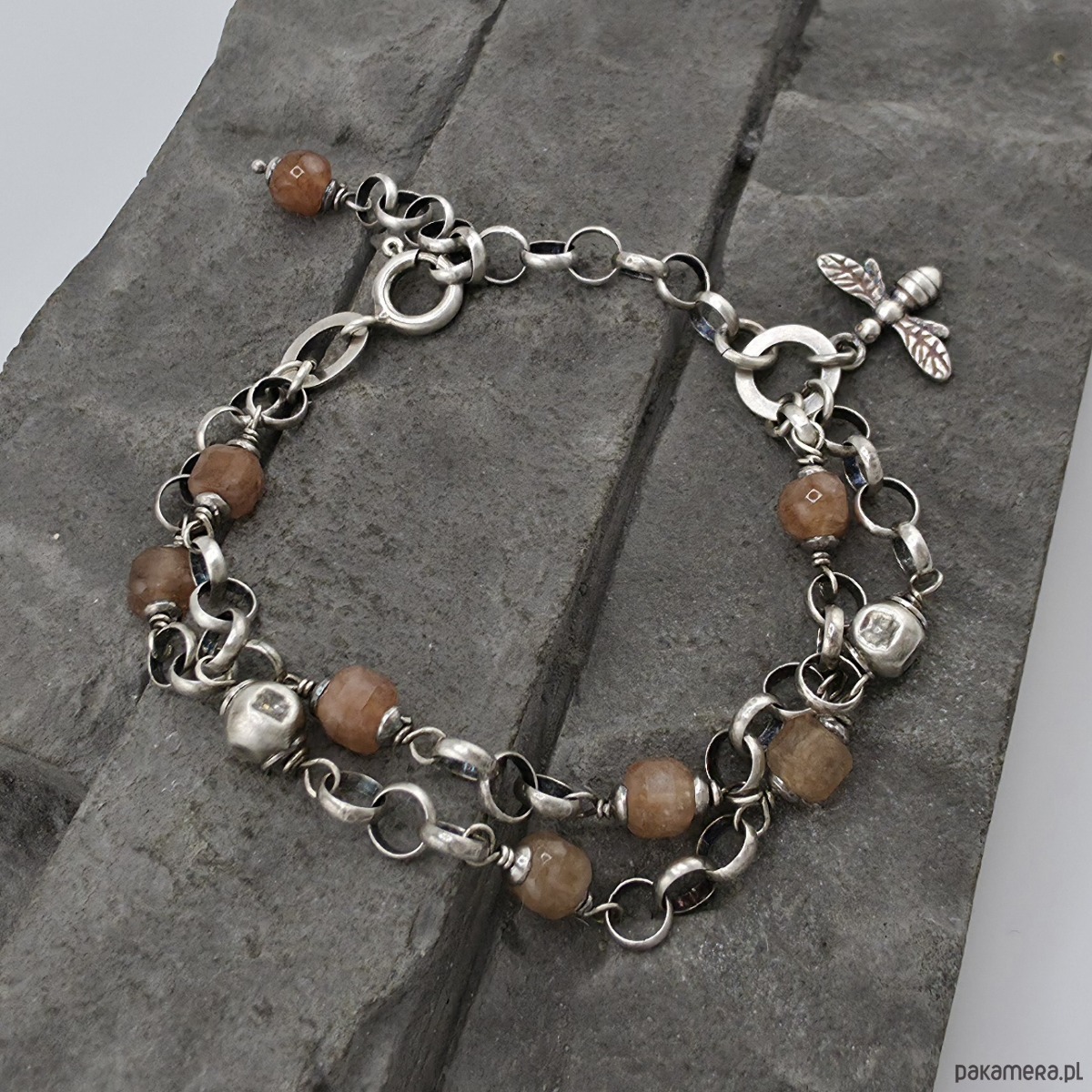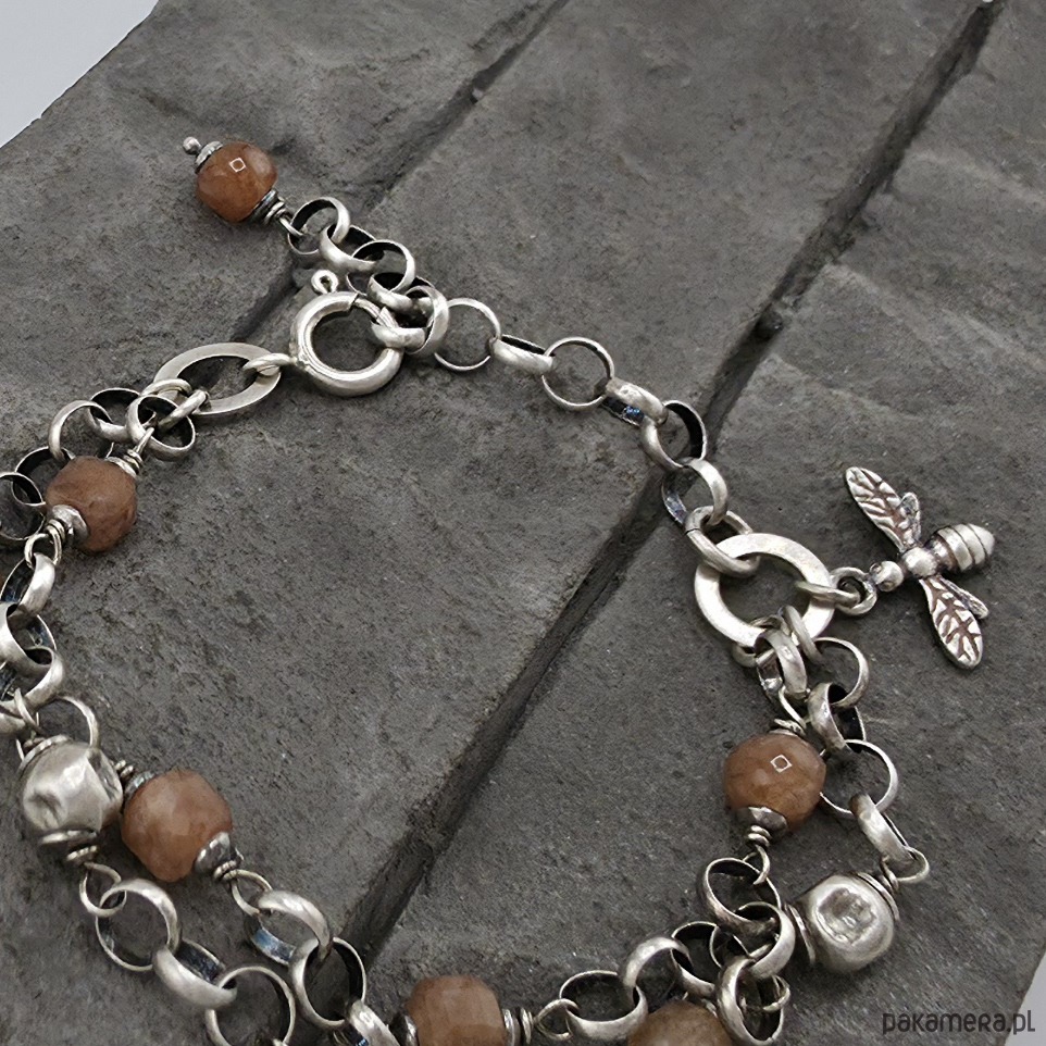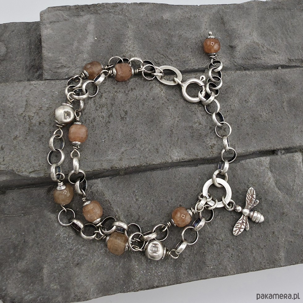 Oryginalna, kobieca bransoletka na co dzień i nie tylko. Wykonana w całości z oksydowanego srebra próby 925 oraz fasetowanych kostek kamienia słonecznego wielkości ok. 5,5 mm. Przy zapieciu zawieszka w ksztalcie pszczoły. Całkowita długość bransoletki regulowana maksymalnie do 20,5 cm. Ogniwa łańcuszka maja średnicę 4 mm. Ozdobnie zapakowana.
