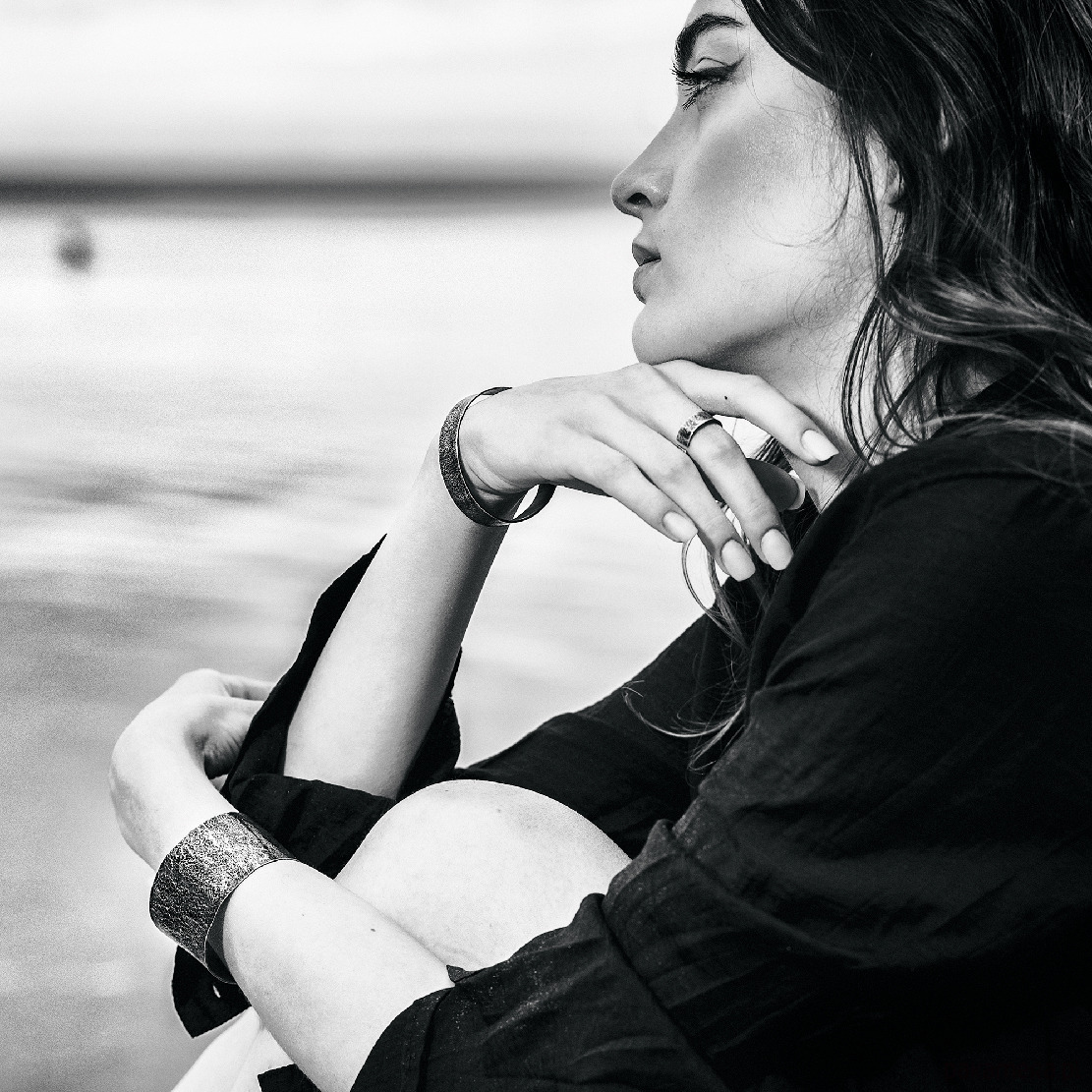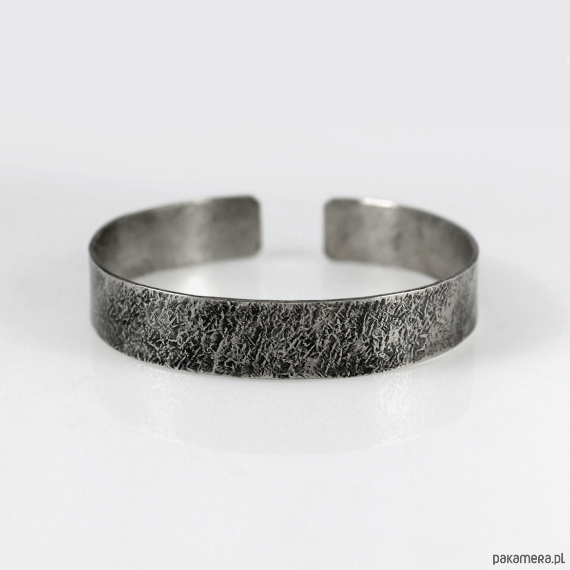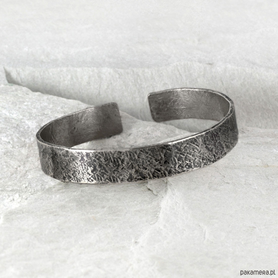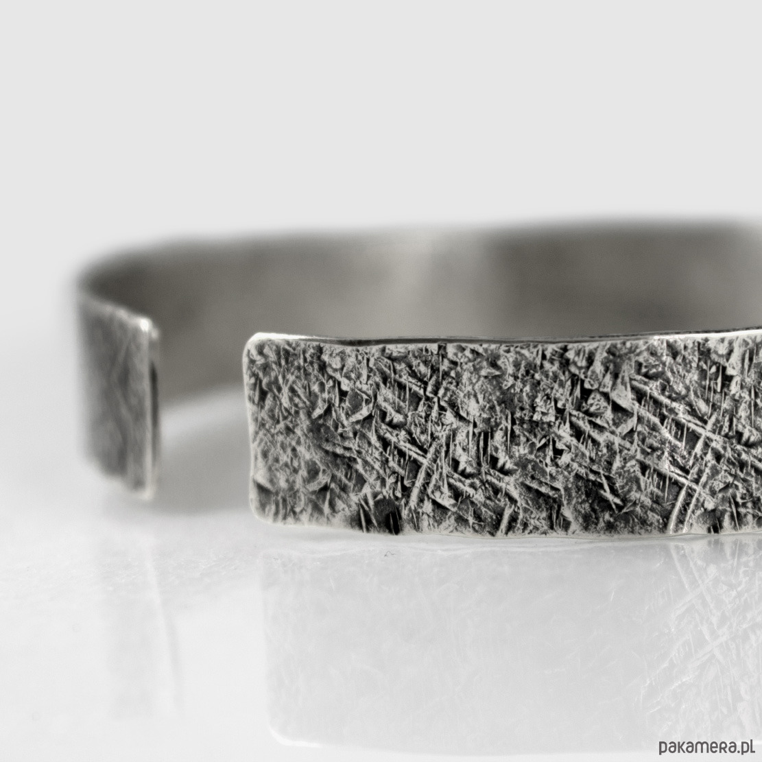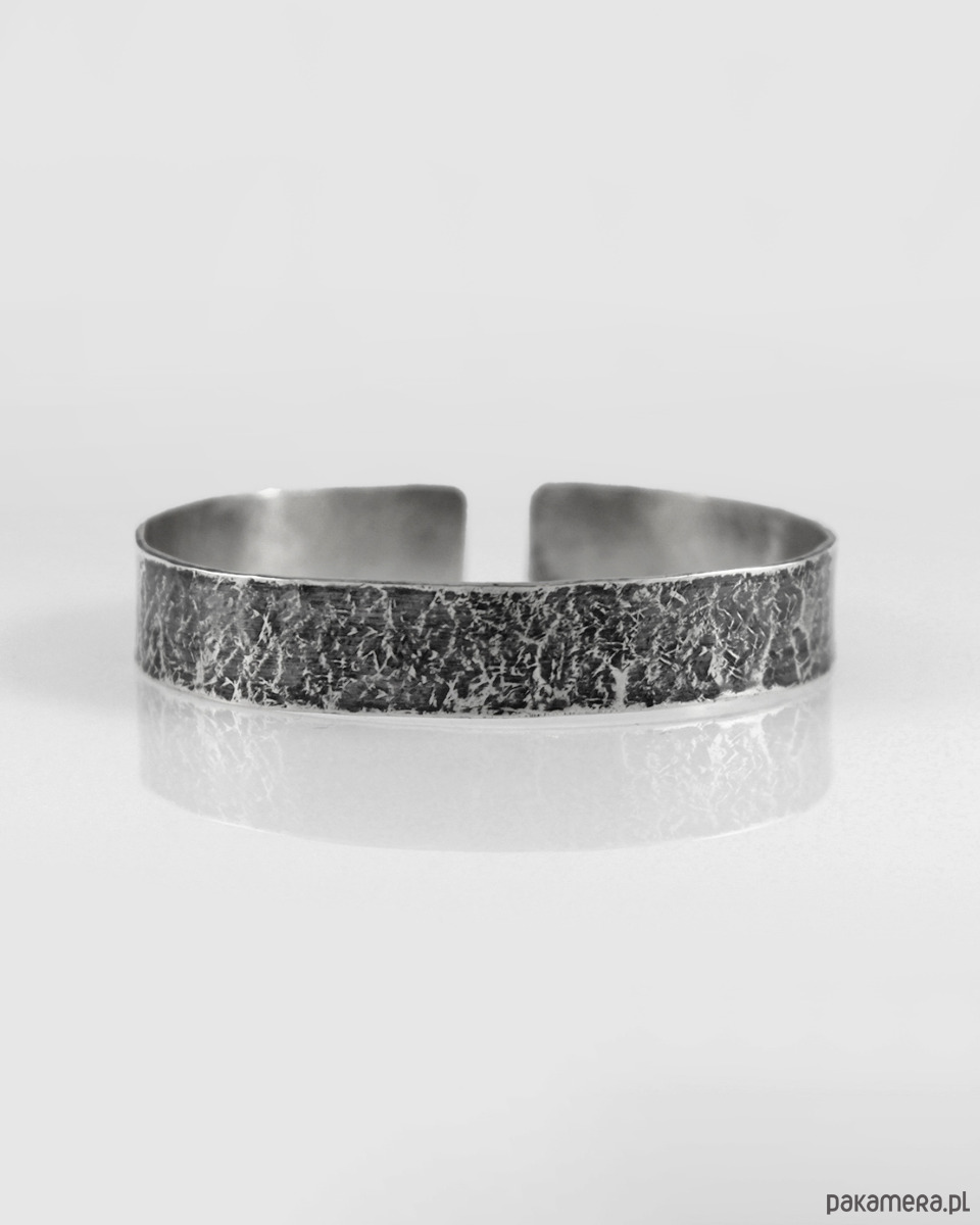Bransoletka została wykonana ze srebra próby 925, jej szerokość to ok 1 cm. Faktura jest lekko podkreślona ciemną patyną uzyskaną w procesie oksydacji (bez użycia sztucznych barwników).