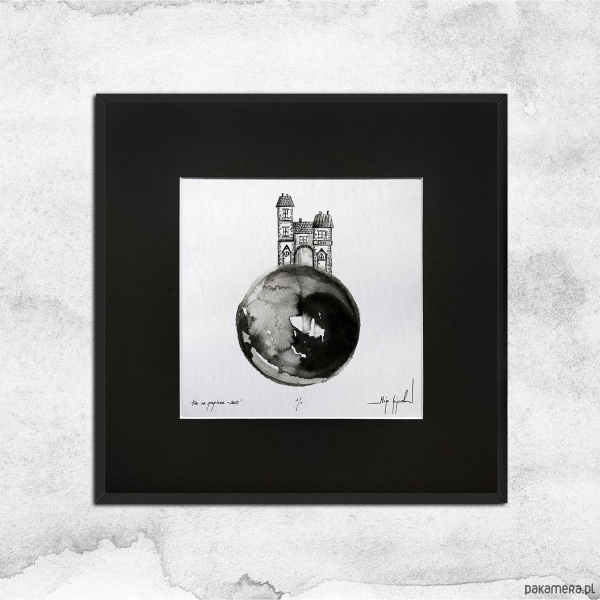 Autorski rysunek malowany ręcznie tuszem na białym, lekko fakturowanym papierze. Pojedyncza sztuka. Praca oprawiona jest w antracytowe passe partout i czarną, aluminiową ramę.