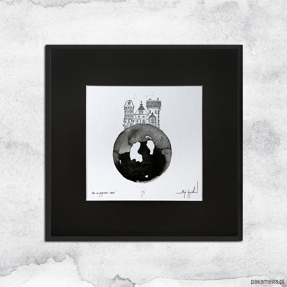 Autorski rysunek malowany ręcznie tuszem na białym, lekko fakturowanym papierze. Pojedyncza sztuka. Praca oprawiona jest w antracytowe passe partout i czarną, aluminiową ramę.