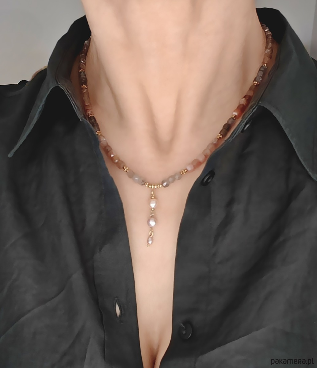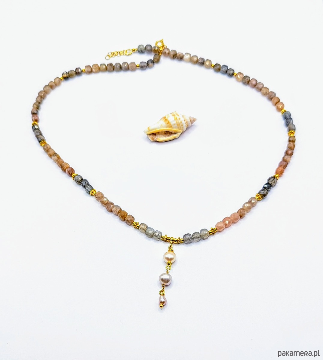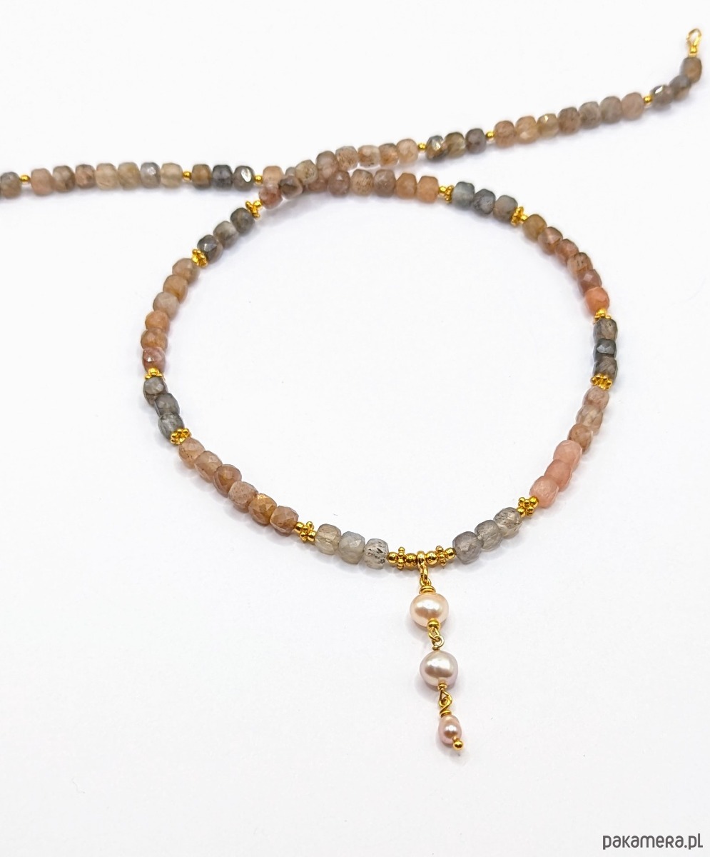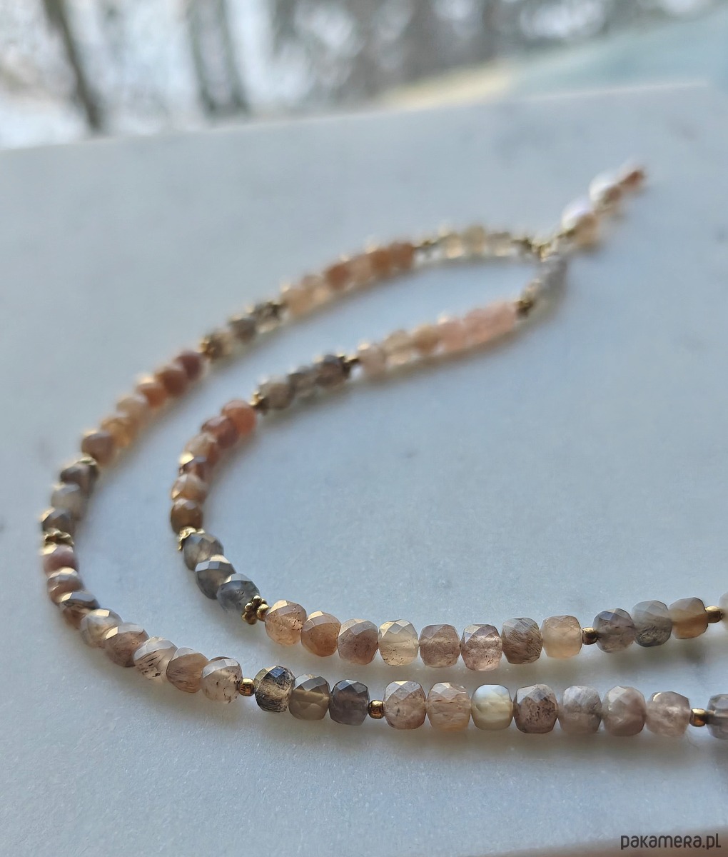 Naszyjnik z pięknie mieniących się kostek kamieni księżycowych i słonecznych w rozmaitych odcieniach. Kamienie w zależności od kąta padania światła ukazują inne barwy. Mają bogate światło wewnętrzne, wiele drobnych plamek i odblasków. Zostały ułożone w sekwencje kolorystyczne - znajduje się tam stalowy grafit, złoto, srebrne i żółtawe odcienie. Ładnie opalizują i są niezwykle energetyczne.