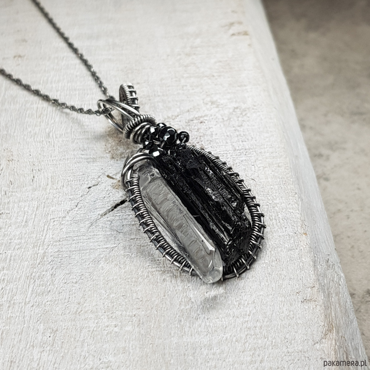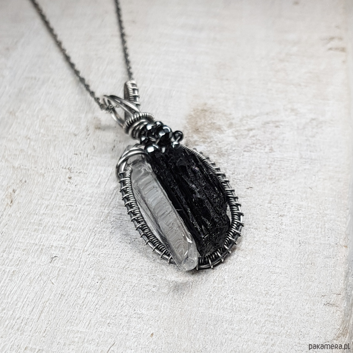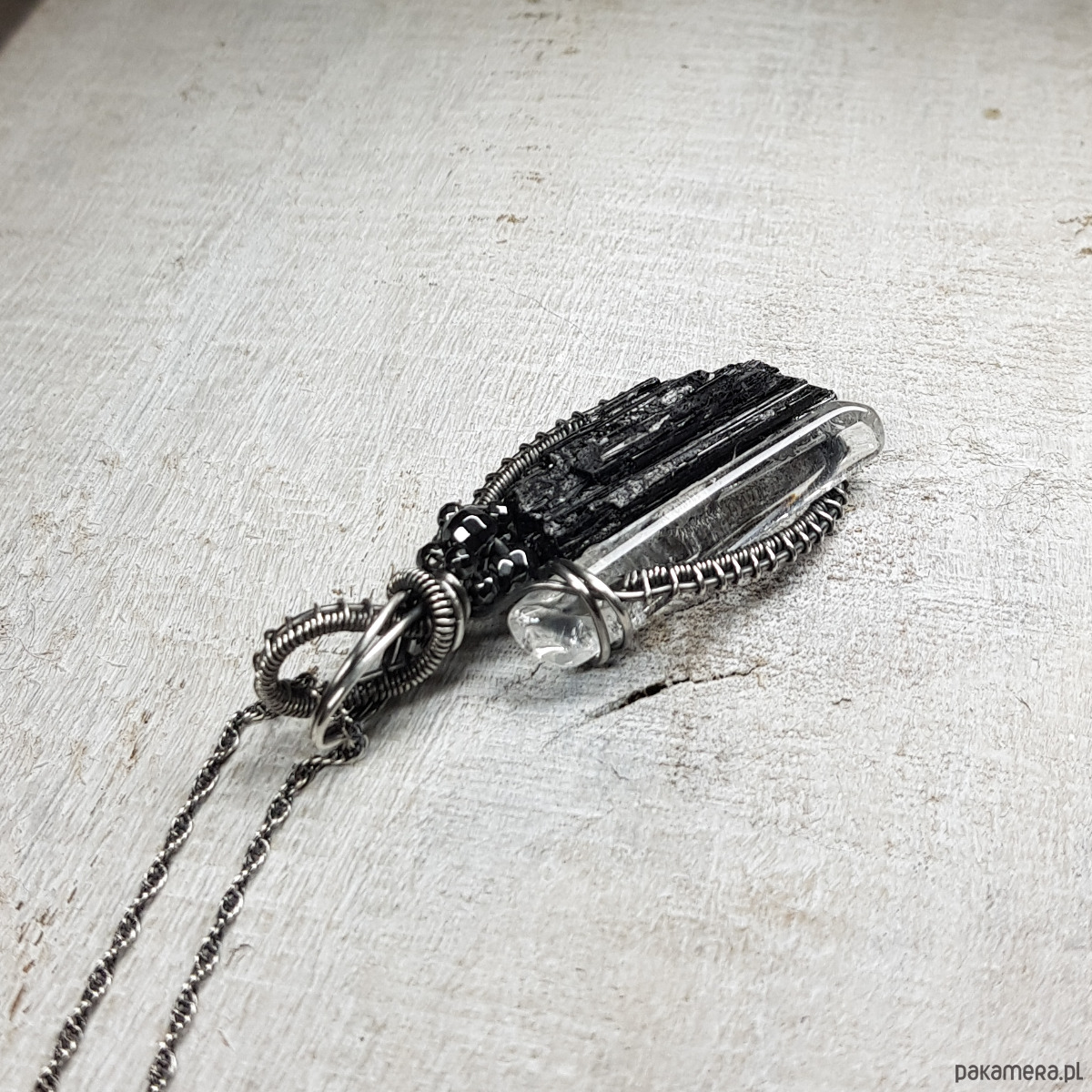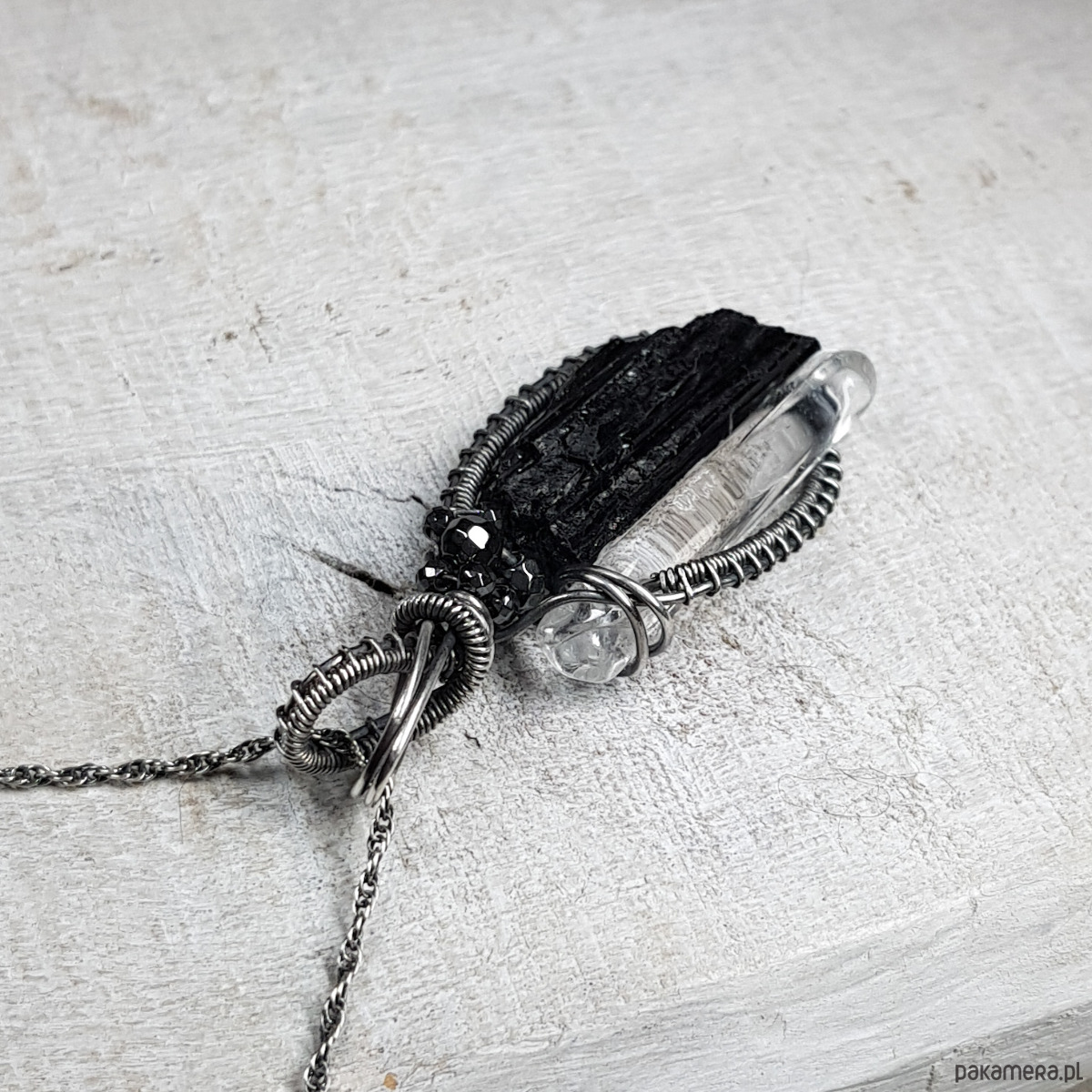 Zawieszka wykonana ręcznie metodą wire-wrappingu z czarnego turmalinu i sopla kryształu górskiego oraz kilku kulek fasetowanego grafitowego hematytu. Do wykonania wisiorka użyłam srebrnego drutu najwyższej próby 999, wymiary zawieszki 50x22mm, z łańcuszkiem długości około 49-50 cm.