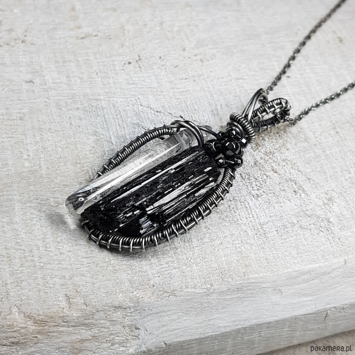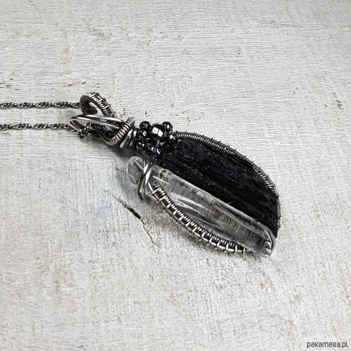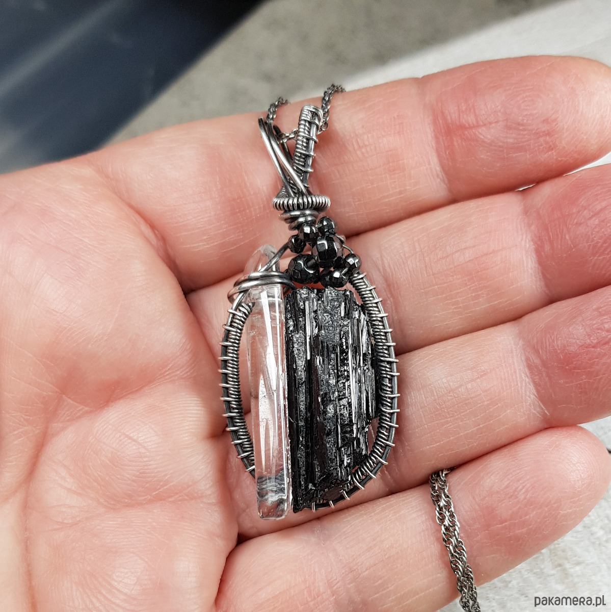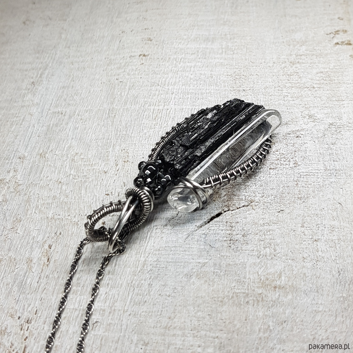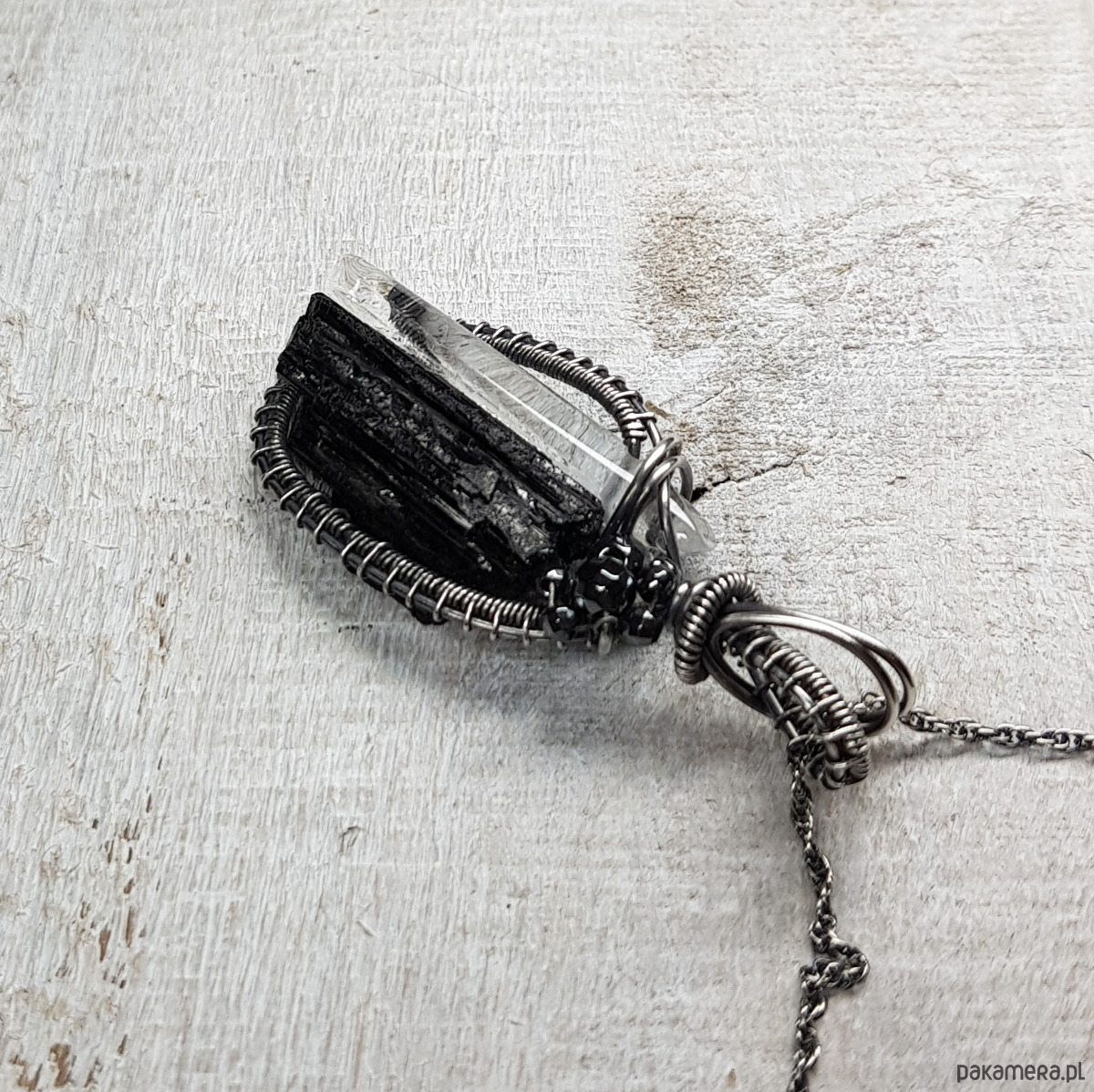 Zawieszka wykonana ręcznie metodą wire-wrappingu z czarnego turmalinu i sopla kryształu górskiego oraz kilku kulek fasetowanego grafitowego hematytu. Do wykonania wisiorka użyłam srebrnego drutu najwyższej próby 999, wymiary zawieszki 50x22mm, z łańcuszkiem długości około 49-50 cm.