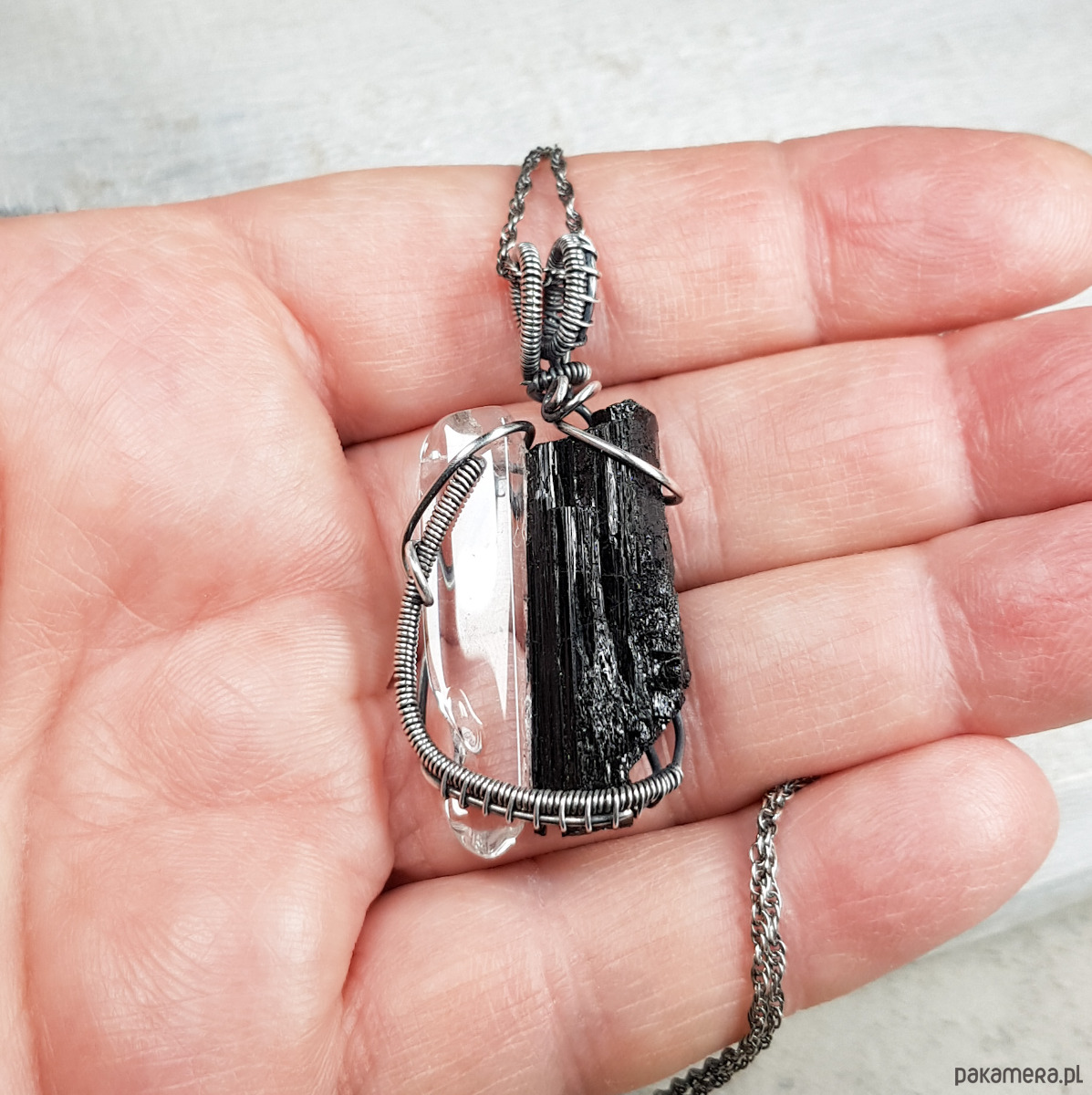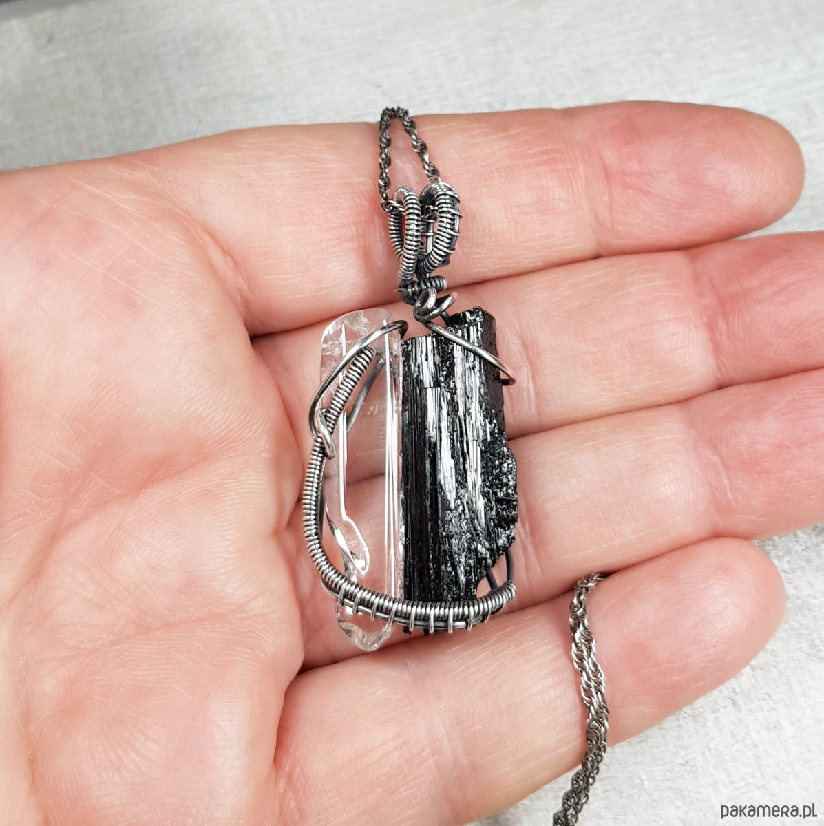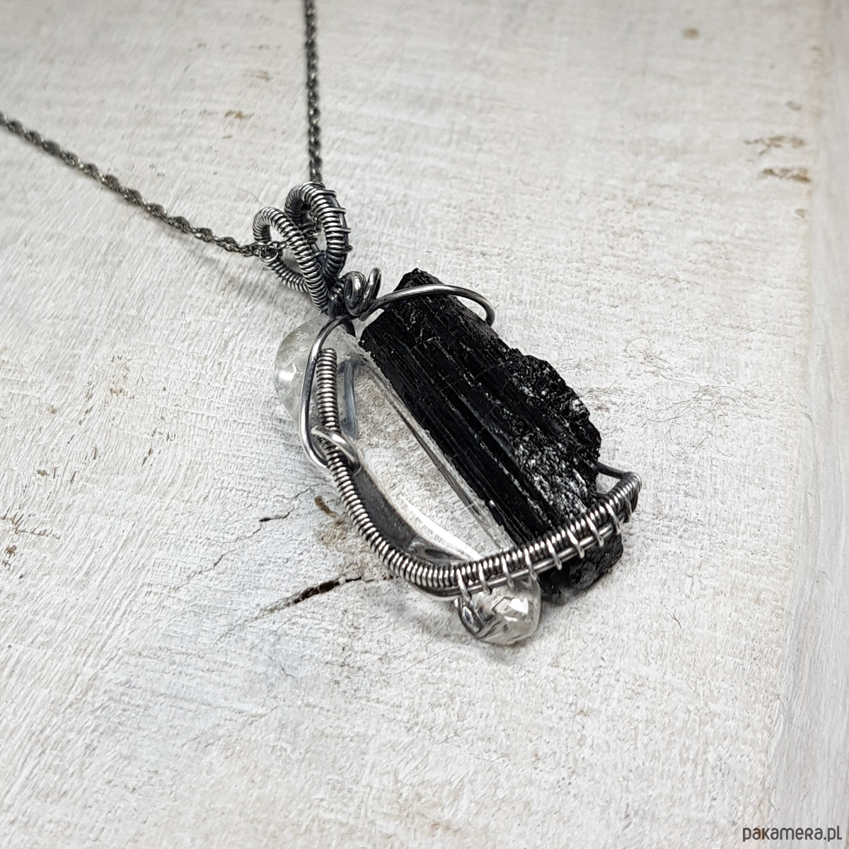 Zawieszka wykonana ręcznie metodą wire-wrappingu z czarnego turmalinu i sopla kryształu górskiego . Do wykonania wisiorka użyłam srebrnego drutu najwyższej próby 999, wymiary zawieszki 44x22mm, z łańcuszkiem długości około 49-50 cm.