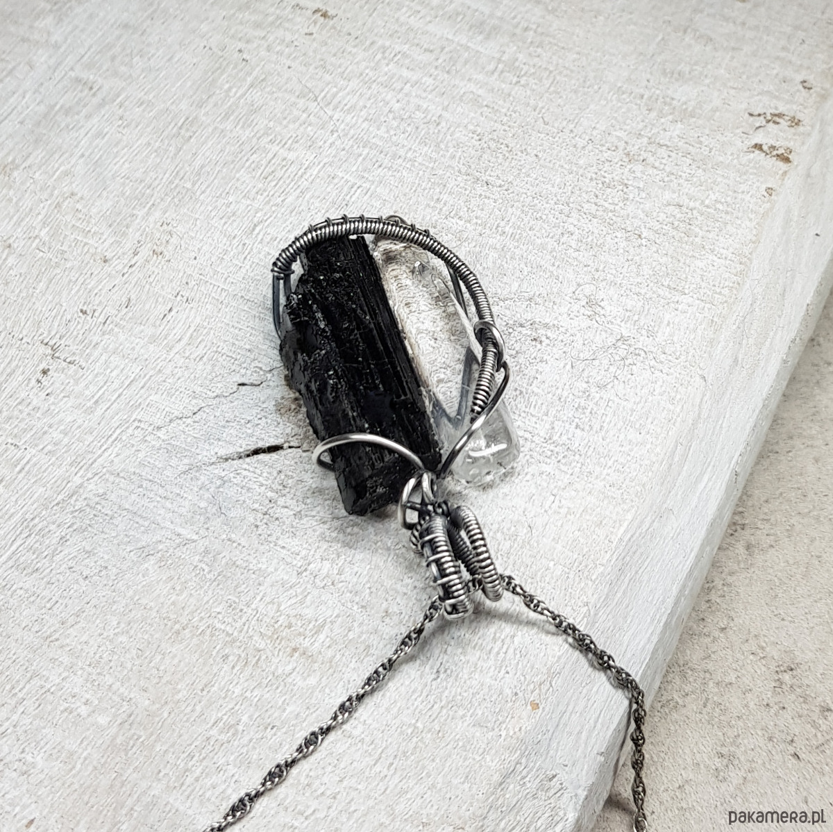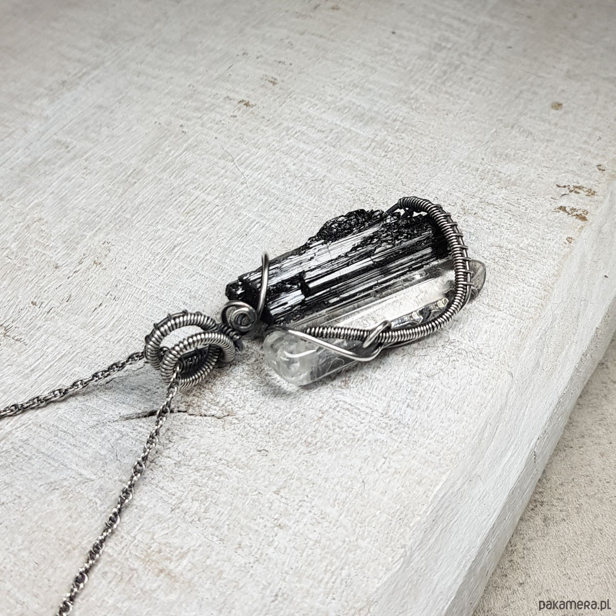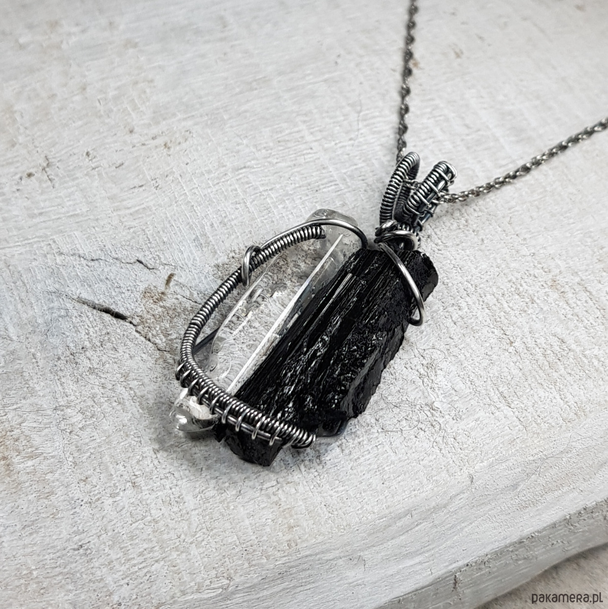 Zawieszka wykonana ręcznie metodą wire-wrappingu z czarnego turmalinu i sopla kryształu górskiego . Do wykonania wisiorka użyłam srebrnego drutu najwyższej próby 999, wymiary zawieszki 44x22mm, z łańcuszkiem długości około 49-50 cm.